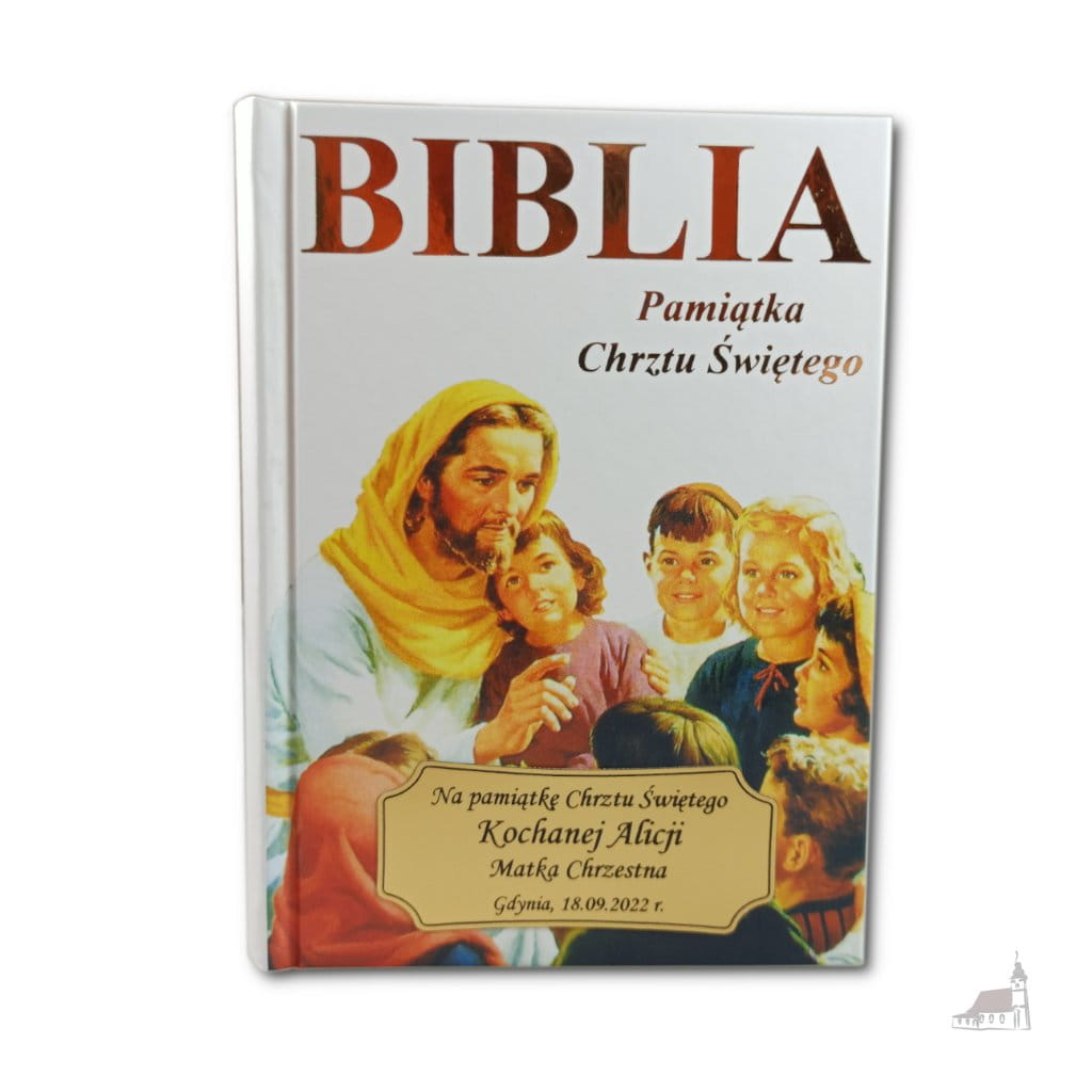 Biała Biblia w wydaniu Pamiątkowym z okazji Chrztu Świętego z personalizowanym grawerem w formacie widocznym poniżej.