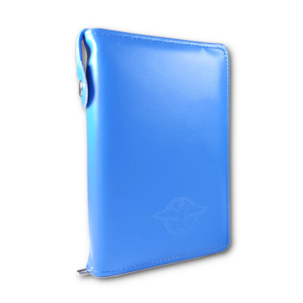 Niebieskie etui zapinane na zamek dopasowane do Pisma Świętego w zestawie.