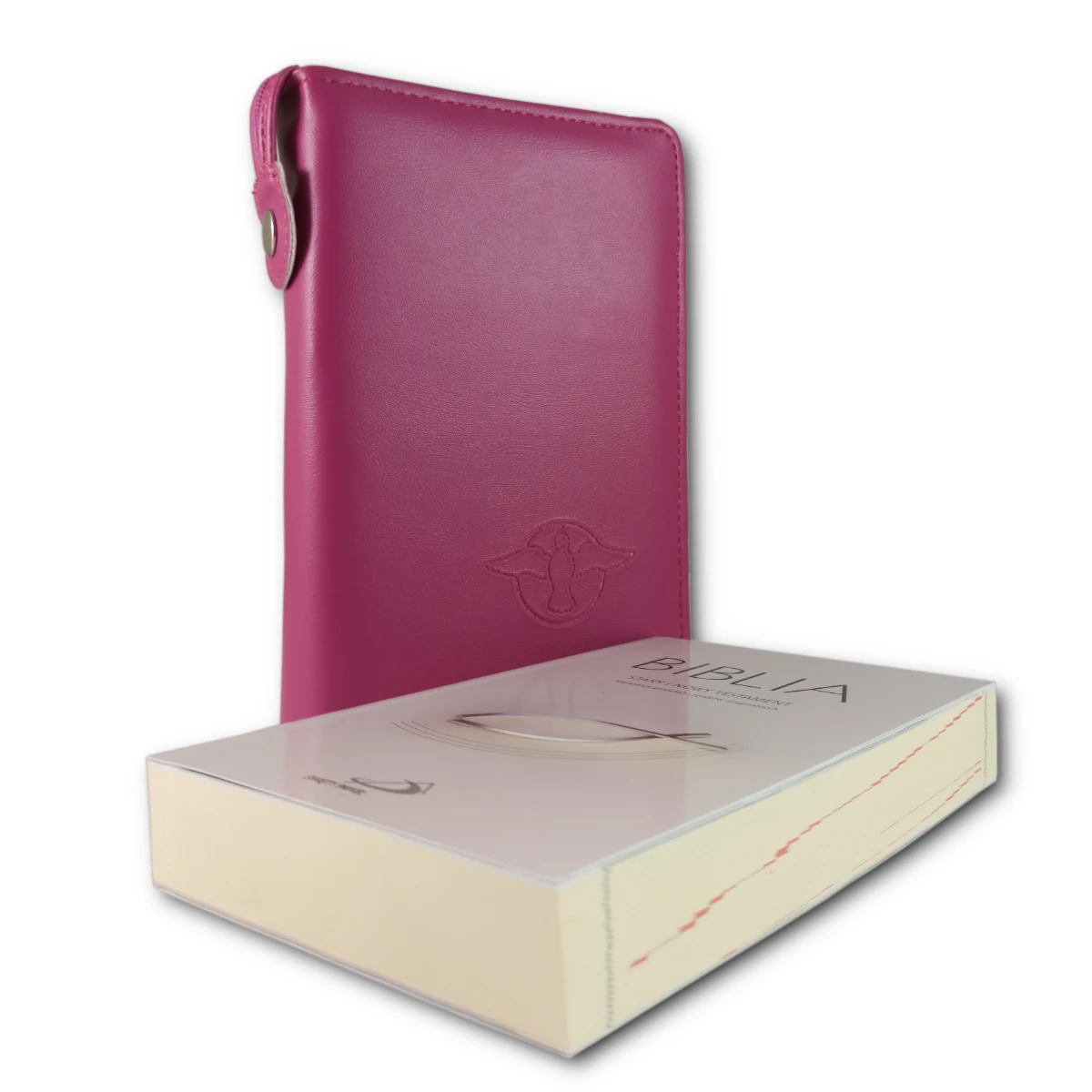 Malinowe etui zapinane na zamek dopasowane do Pisma Świętego w zestawie.
