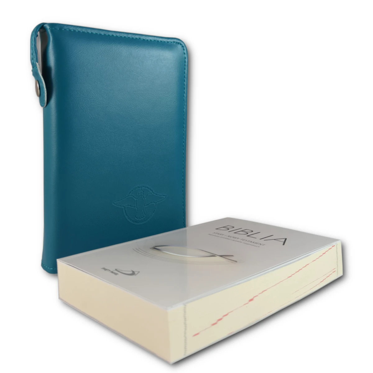 Turkusowe etui zapinane na zamek dopasowane do Pisma Świętego w zestawie.