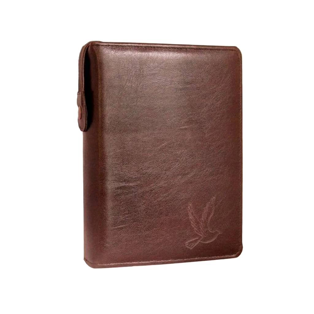 Etui wykonane ze skaju w kolorze kasztanowym, zamykane na zamek zapewnia dłuższą żywotność Pisma Świętego.