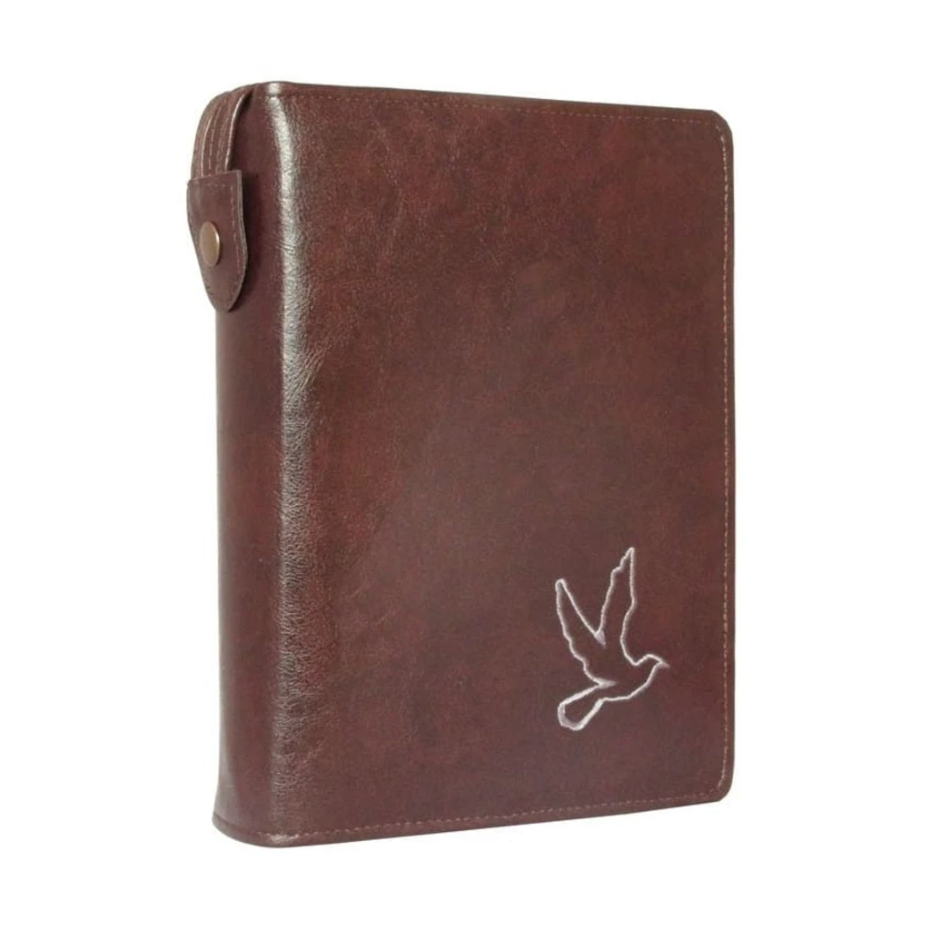 Etui wykonane ze skaju w kolorze kasztanowym ozdobione haftem, zamykane na zamek zapewnia dłuższą żywotność Pisma Świętego.