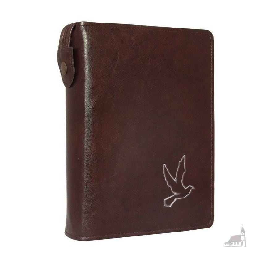 Etui wykonane ze skaju w kolorze brązowym ozdobione haftem, zamykane na zamek zapewnia dłuższą żywotność Pisma Świętego.