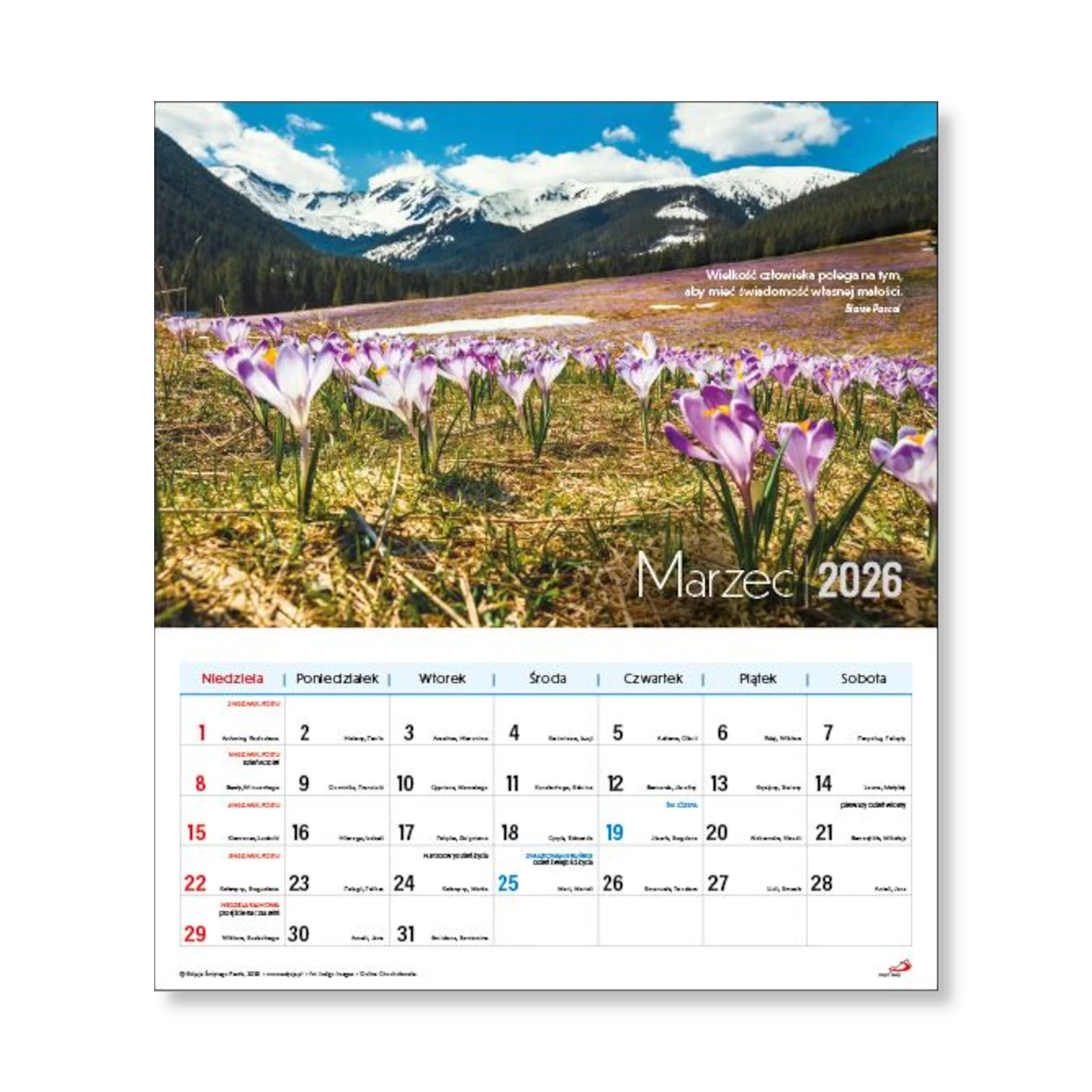 Dodatkowy atut kalendarza to wymiary: 33,50 x 38,00 cm, które czynią kalendarz czytelnym i wygodnym w użyciu.