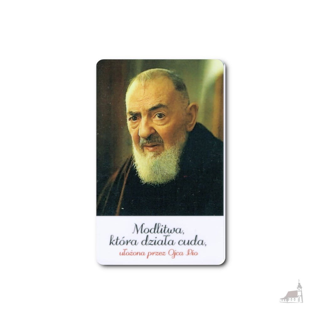 Na jednej stronie karty odnajdziemy wizerunek Ojca Pio, na odwrocie Modlitwa, która działa cuda.