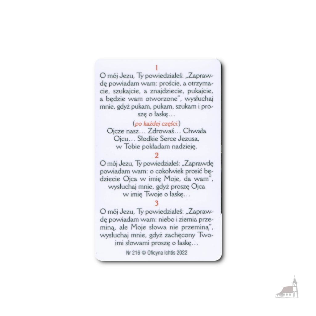 Wysokiej jakości obrazek z modlitwą wykonany z tworzywa w formacie typowej karty płatniczej.