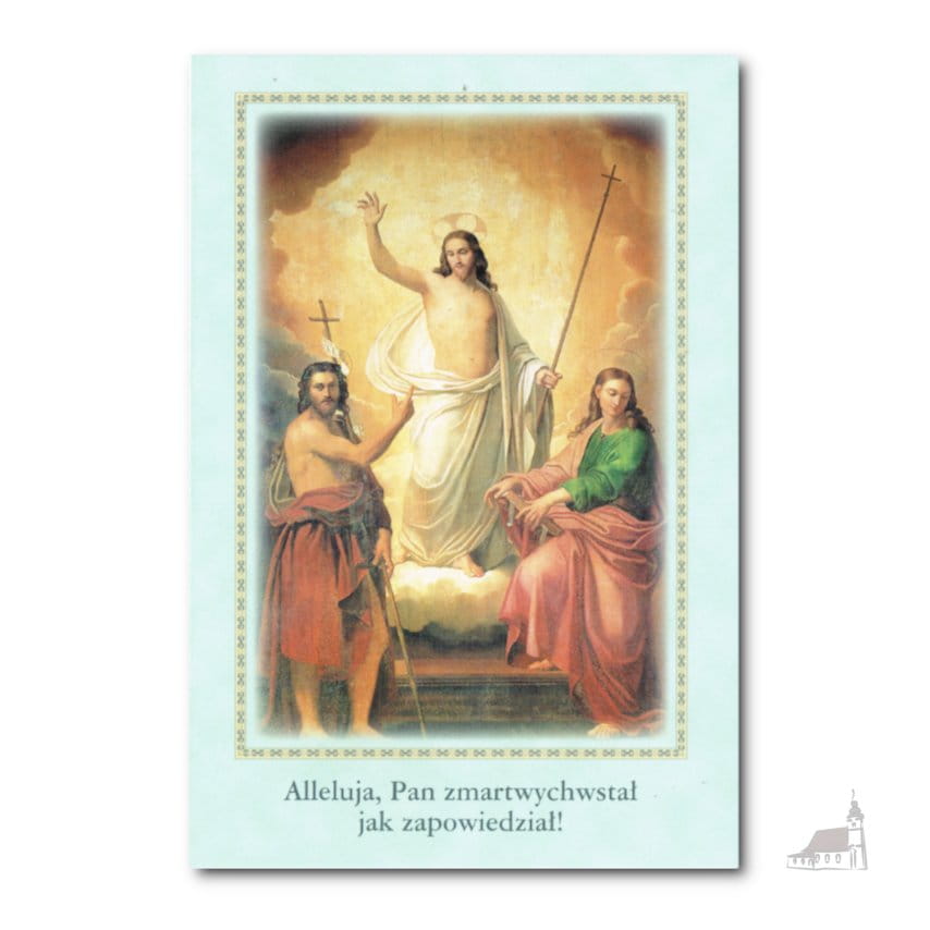 Karnet przedstawia obraz ukazujący Jezusa Chrystusa Zmartwychwstałego w białej szacie z Maryją i Świętym Janem, a także tekst biblijny: „Alleluja! Pan zmartwychwstał, jak zapowiedział!”