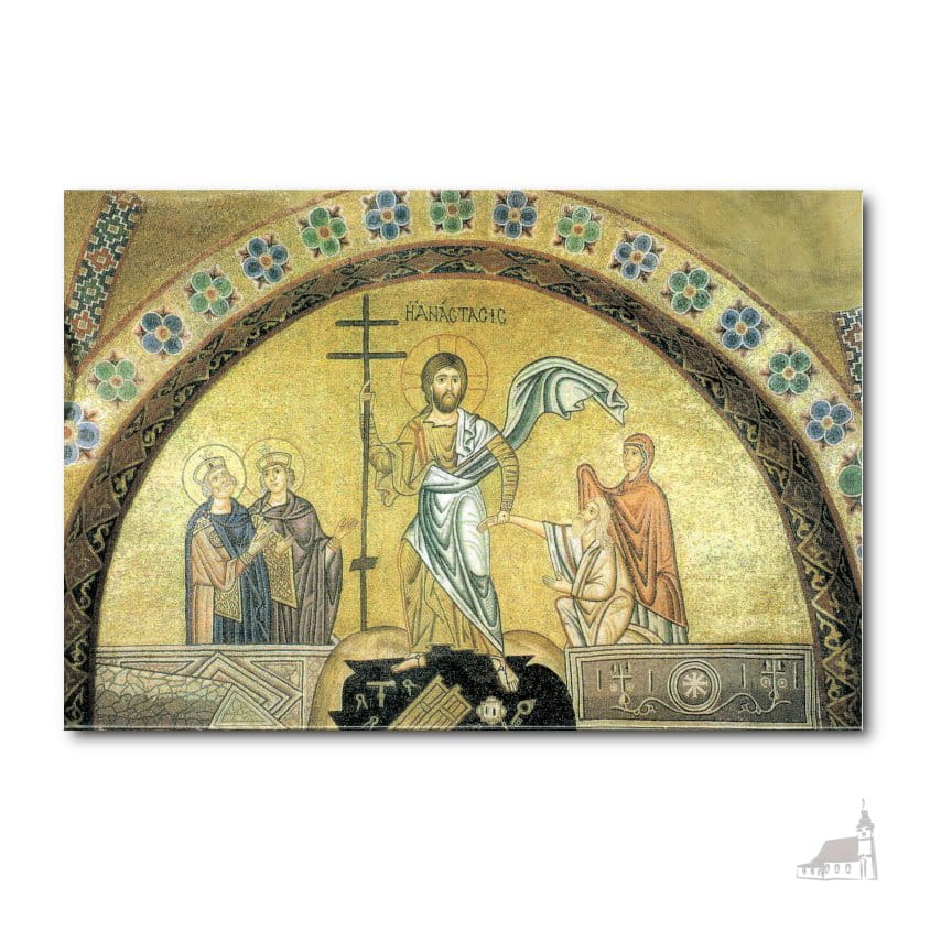 Karnet z kopertą, przedstawia mozaikę Zejście do piekła ukazującą Jezusa Chrystusa Zmartwychwstałego w białej szacie z krzyżem.