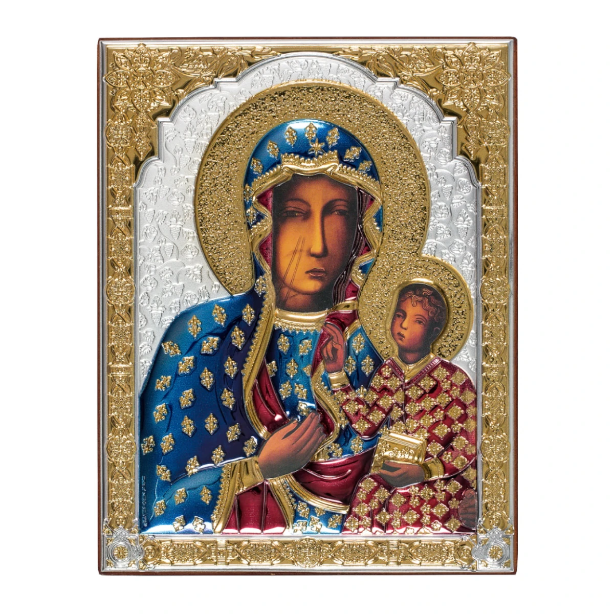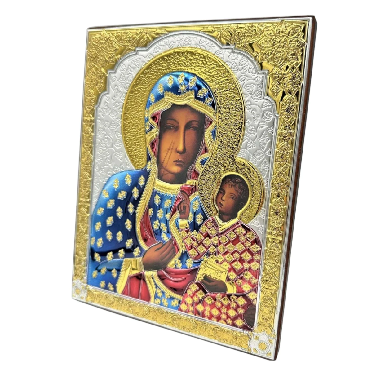 Wysokiej jakości obrazek wykonany ze srebra próby 925 o łącznej masie do 2g dodatkowo częściowo zdobiony 24 karatowym złotem oraz kolorową emalią. Pod koszulką znajduje się cały wizerunek obrazu ikony. Zewnętrzna warstwa srebra pokryta jest zabezpieczającym lakierem, dzięki któremu produkt zachowa swój blask na lata. Tył obrazka wykonano z lakierowanego drewna, na którym istnieje możliwość wykonania graweru w postaci naklejanej płytki, podkreślającego wyjątkowy charakter prezentu.