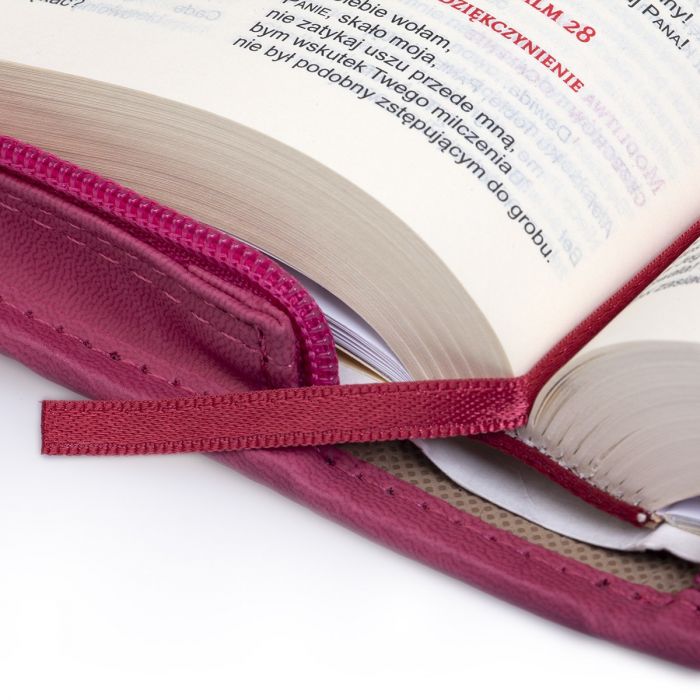 Biblia "z rybką" - Stary i Nowy Testament z przypisami. oprawa malinowa zapinana na zamek