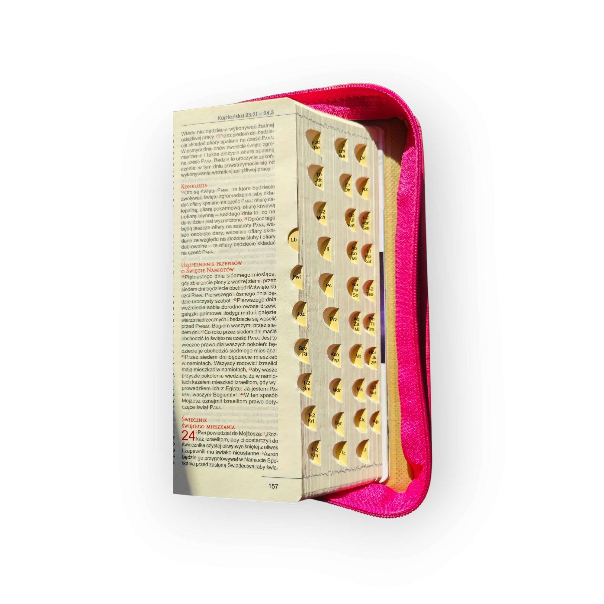 Biblia "z rybką" - Stary i Nowy Testament z przypisami. oprawa malinowa zapinana na zamek paginowana