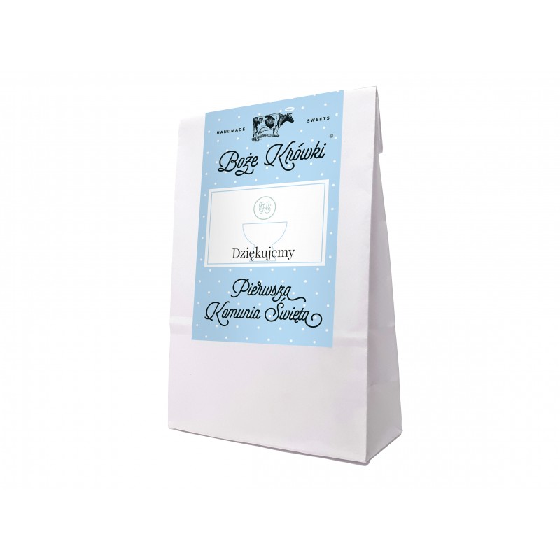 Boże Krówki zapakowane w elegancką papierową torebkę zamkniętą naklejką, na której są umieszczone niezbędne informacje o produkcie.