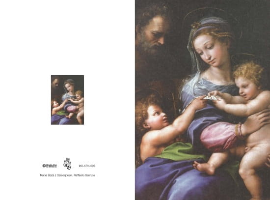 Karnet przedstawia obraz Rafaello Sennzio Matka Boża z Dzieciątkiem ukazujący moment narodzin Jezusa nad którym czuwa Maryja i Józef