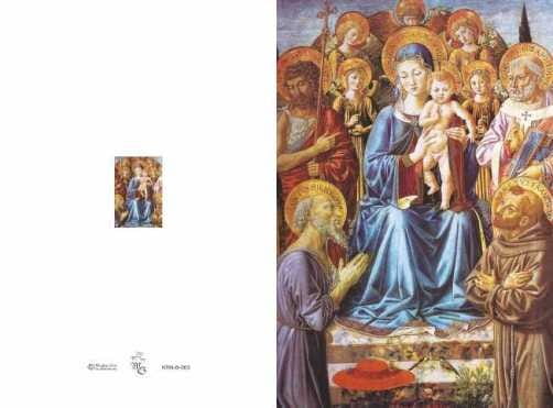 Karnet przedstawia obraz Boże Narodzenie ukazujący dzieciątko Jezus na rękach Maryi, zaś wokół nich są święci m. in. święty Piotr i święty Franciszek, a także Jezus Zmartwychwstały