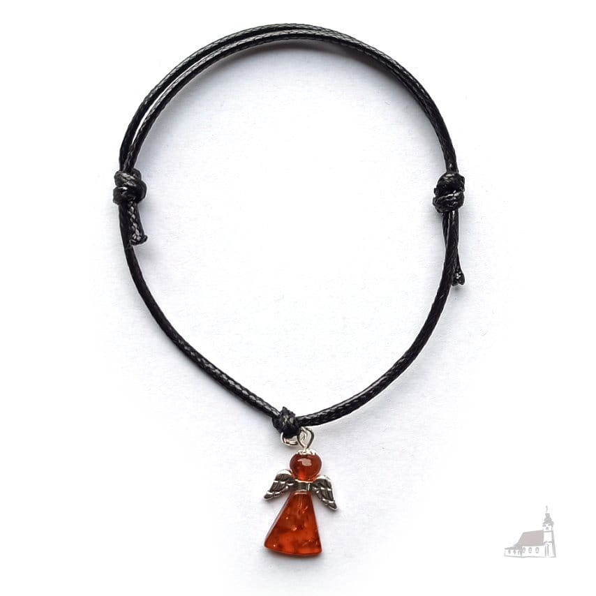 Bransoletka na sznurku. Aniołek z bursztynu ze srebrem. Czarna