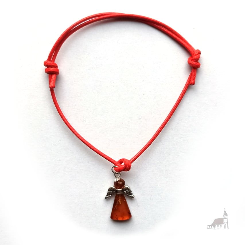 Bransoletka na sznurku. Aniołek z bursztynu ze srebrem. Czerwona