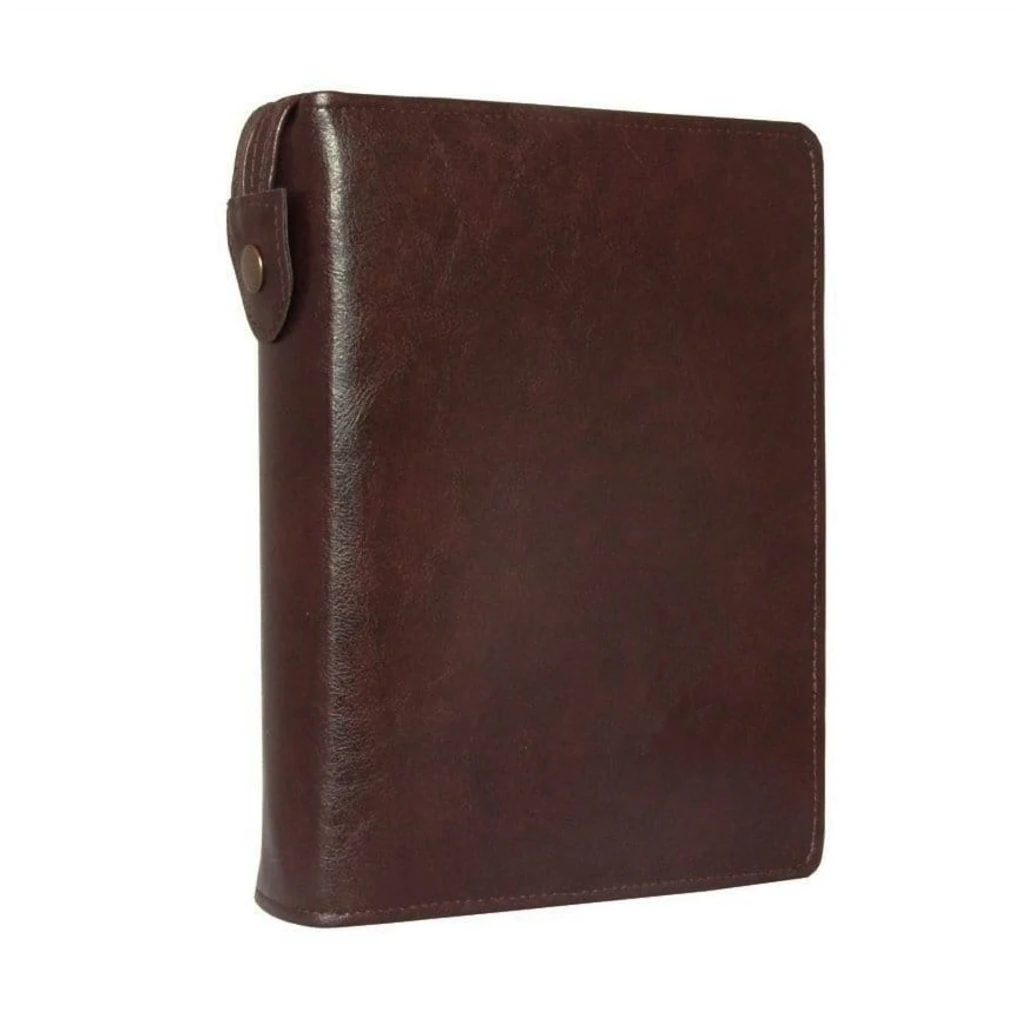 Etui wykonane z brązowego skaju, zamykane na zamek zapewnia dłuższą żywotność Pisma Świętego.