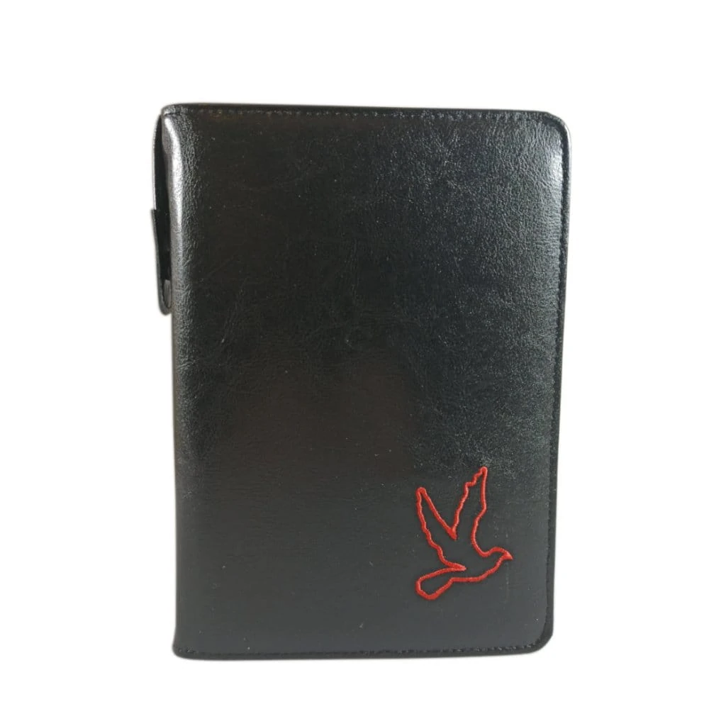Etui wykonane z czarnego skaju ozdobione czerwonym haftem, zamykane na zamek zapewnia dłuższą żywotność Pisma Świętego.