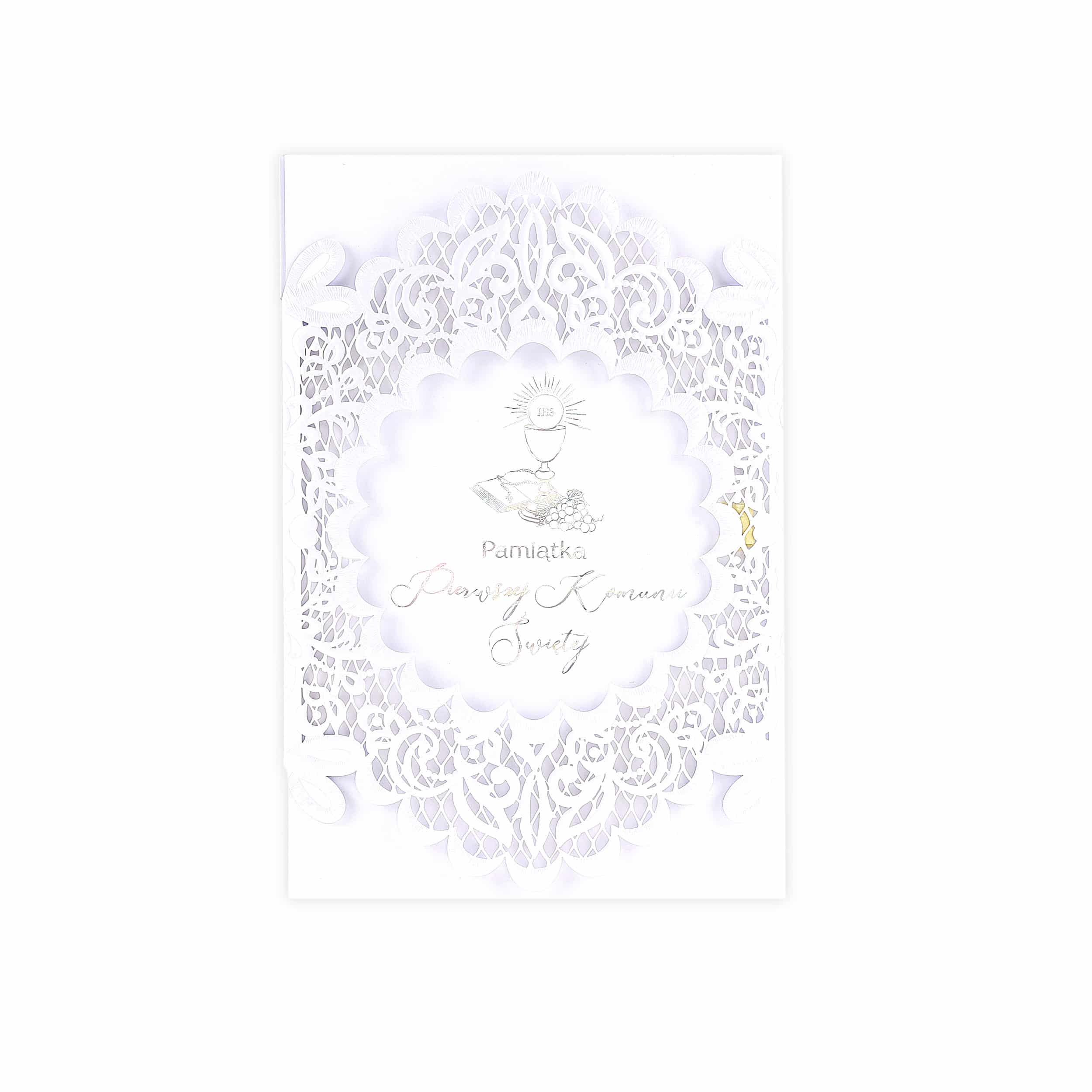 Kartka B6 wykonana z najwyższą starannością, stanowi połączenie nowoczesnego wzornictwa z elegancją, dzięki czemu jest doskonałym wyborem na przyjęcie I Komunii Świętej.