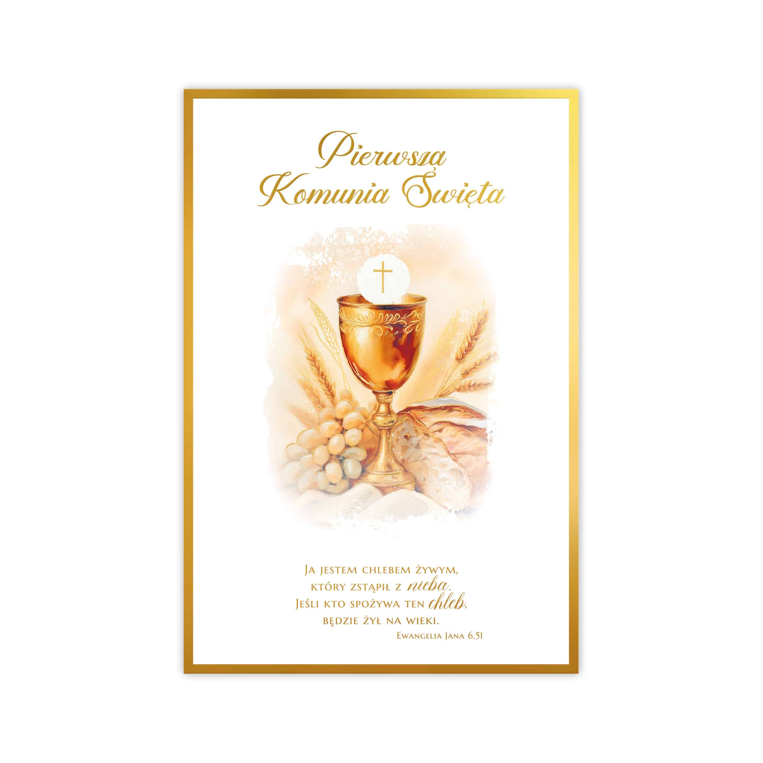 Kartka B6 wykonana z najwyższą starannością, stanowi połączenie nowoczesnego wzornictwa z elegancją, dzięki czemu jest doskonałym wyborem na przyjęcie I Komunii Świętej. Zaprojektowana w stylu akwarelowego obrazu, zachwyca połączeniem złocenia z delikatną ilustracją.