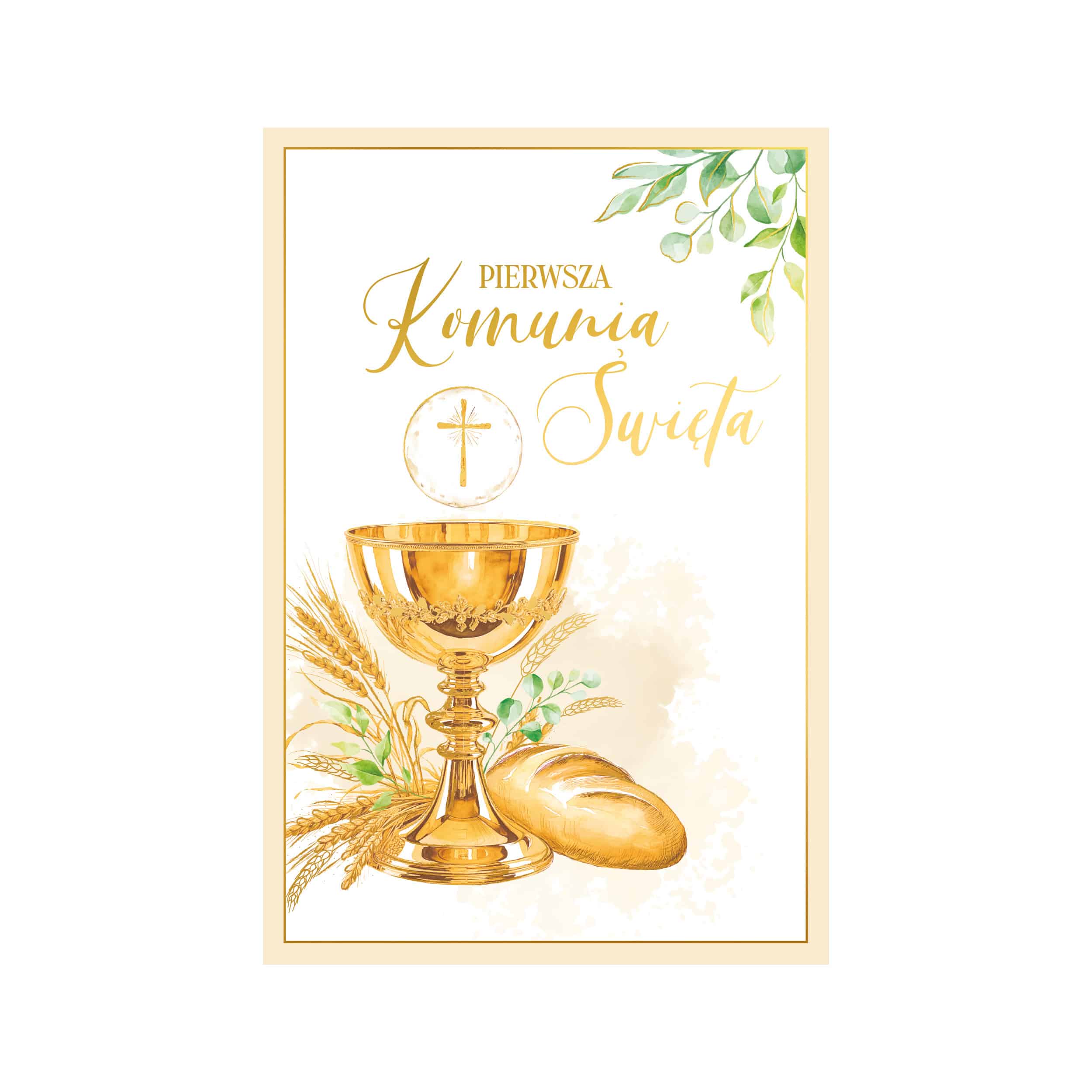Kartka B6 wykonana z najwyższą starannością, stanowi połączenie nowoczesnego wzornictwa z elegancją, dzięki czemu jest doskonałym wyborem na przyjęcie I Komunii Świętej. Zaprojektowana w stylu akwarelowego obrazu, zachwyca połączeniem złocenia z delikatną ilustracją.