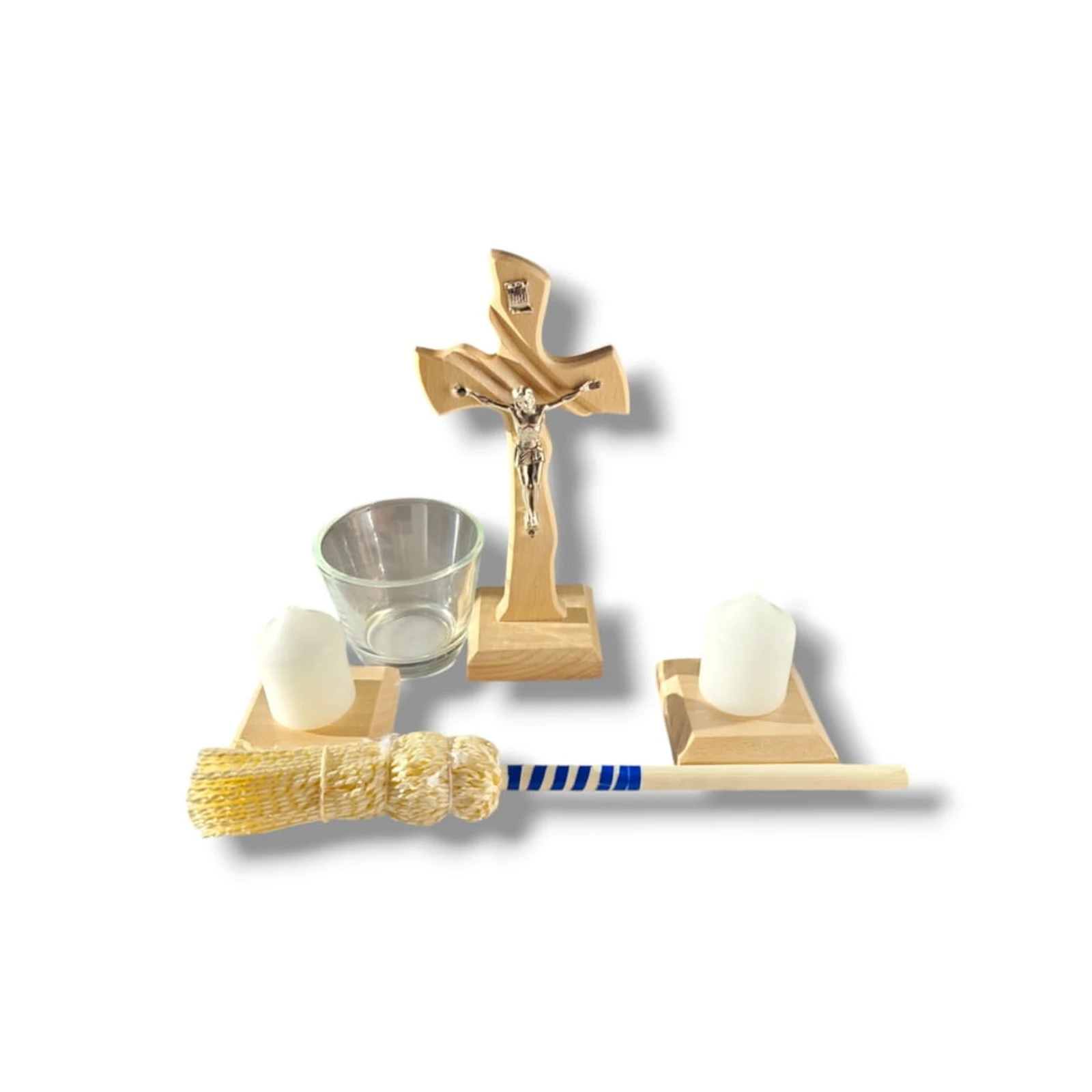 W komplecie znajdziemy krzyż, dwa świeczniki z świecami, naczynko na wodę święconą oraz kropidło.