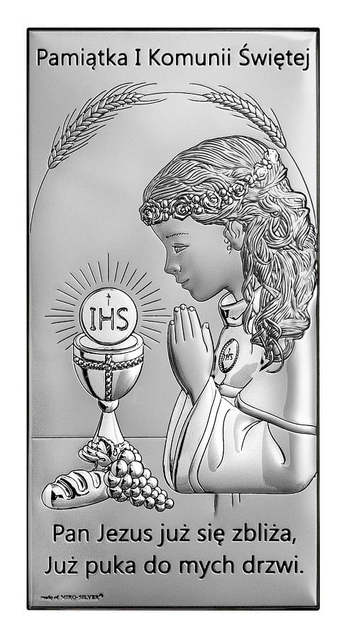 Obrazek srebrny z wizerunkiem dziewczynki przyjmującej Pierwszą Komunię Świętą.