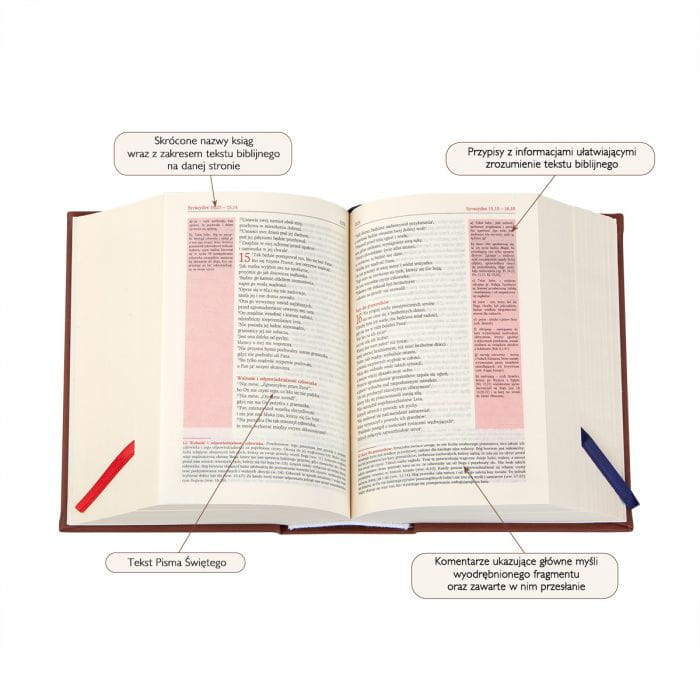 Nowy przekład Pisma Świętego zawiera liczne komentarze, przypisy, wprowadzenia do poszczególnych ksiąg, teksty paralelne, tablice chronologiczne, mapy, a także słownik terminów biblijnych. Te pomoce pomogą Ci zrozumieć tekst biblijny, a także dostrzec główne myśli i przesłanie w nim zawarte.
