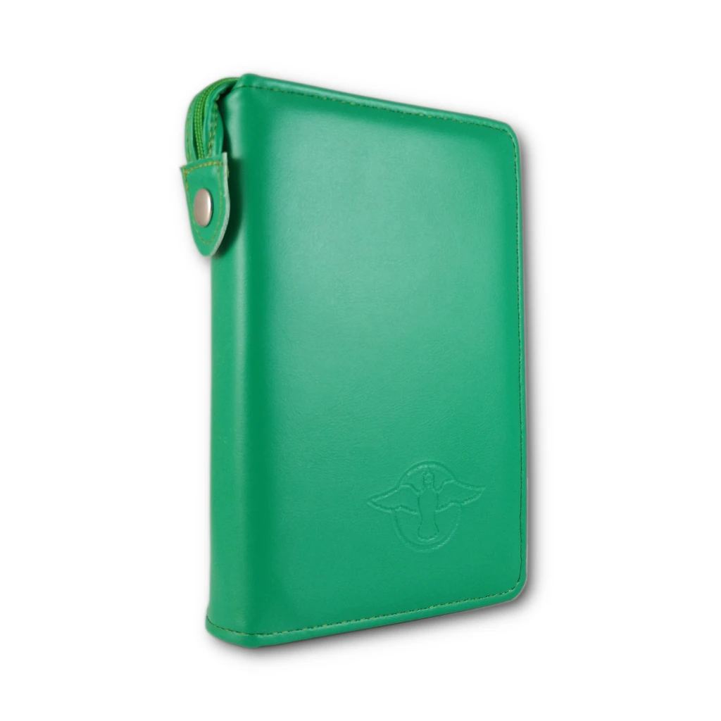 Ciemno zielone etui zapinane na zamek dopasowane do Pisma Świętego.