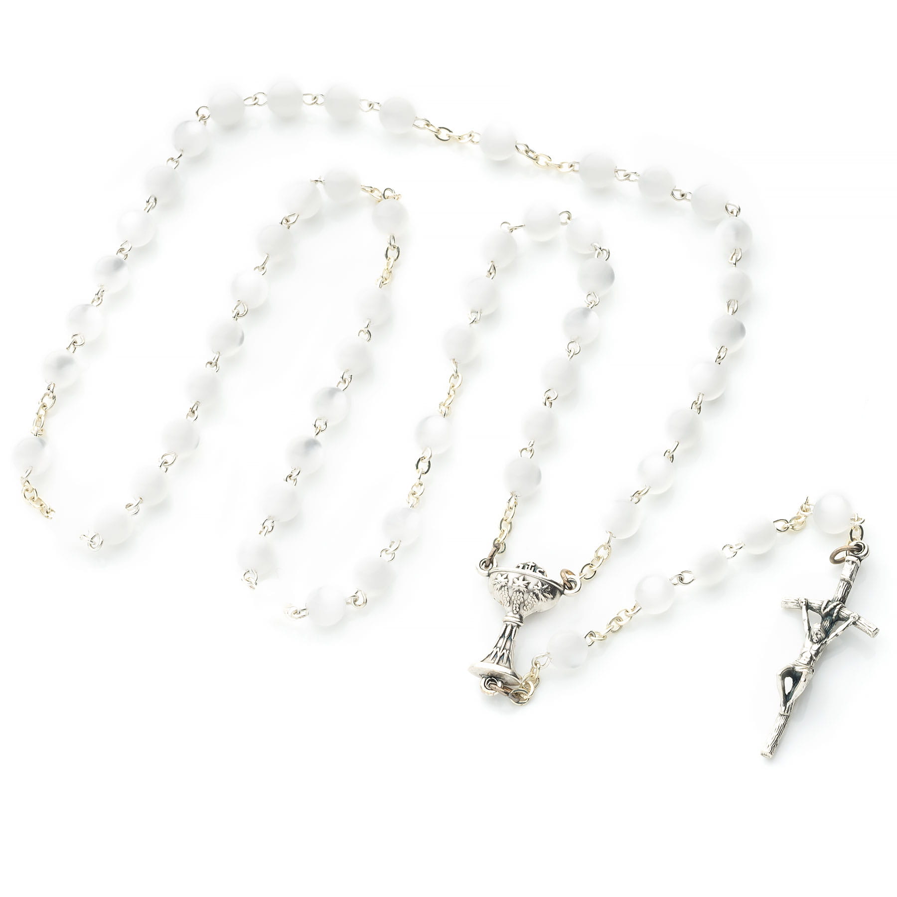 Różaniec, koraliki w białym kolorze perłowym. Pamiątka Pierwszej Komunii Świętej.