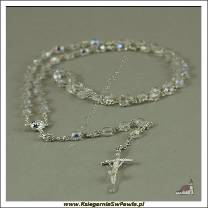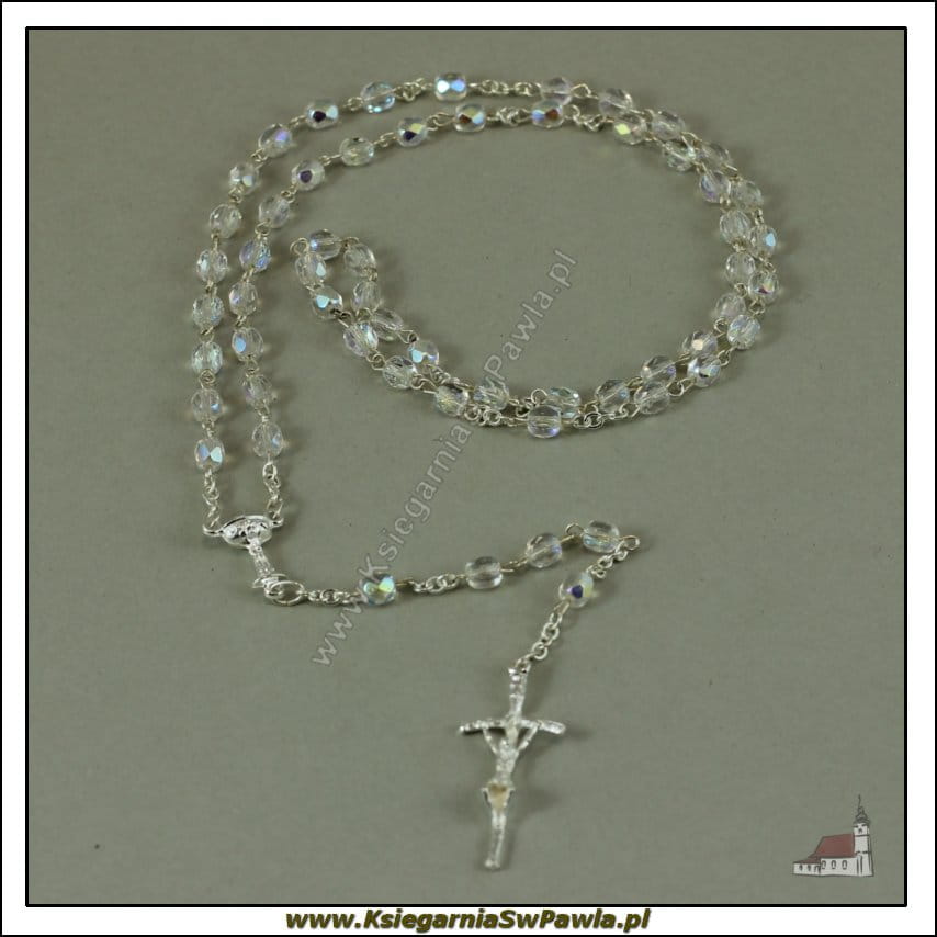 Różaniec, koraliki fasetowane, białe, przezroczyste. Pamiątka Pierwszej Komunii Świętej.