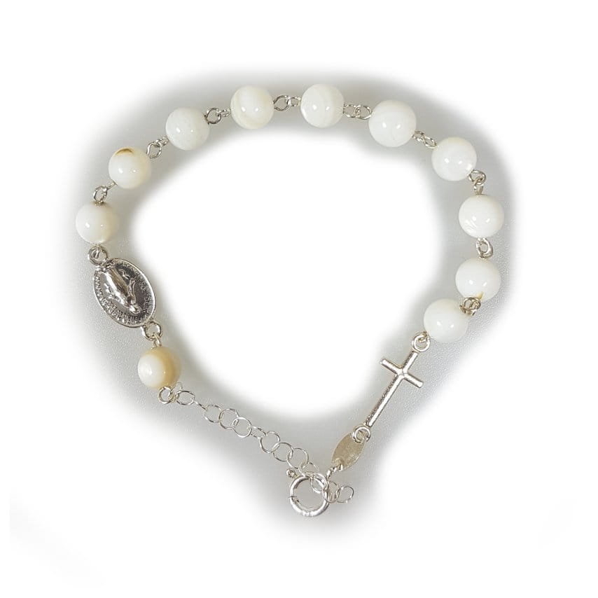 Różaniec dziesiątka w formie bransoletki z paciorkami z muszli.