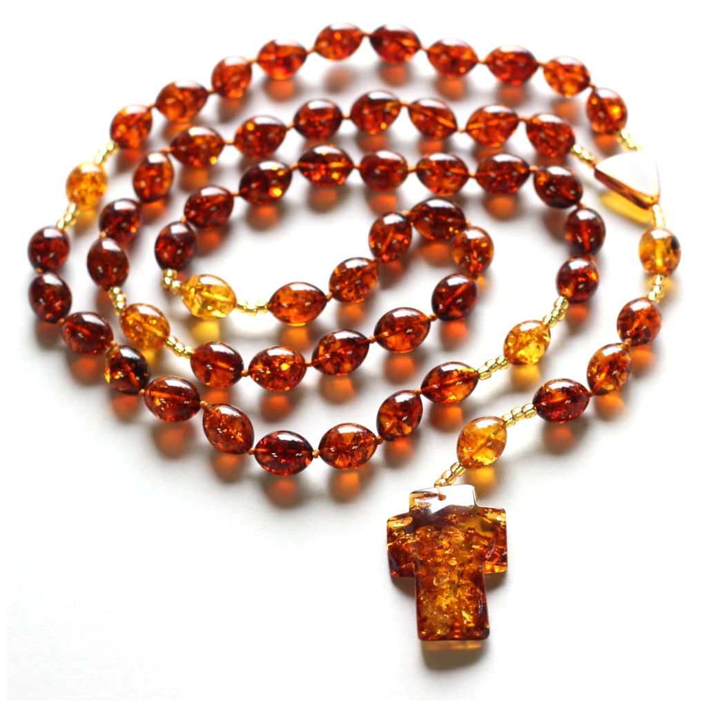 Różaniec bursztynowy, nawleczony na sznurek.