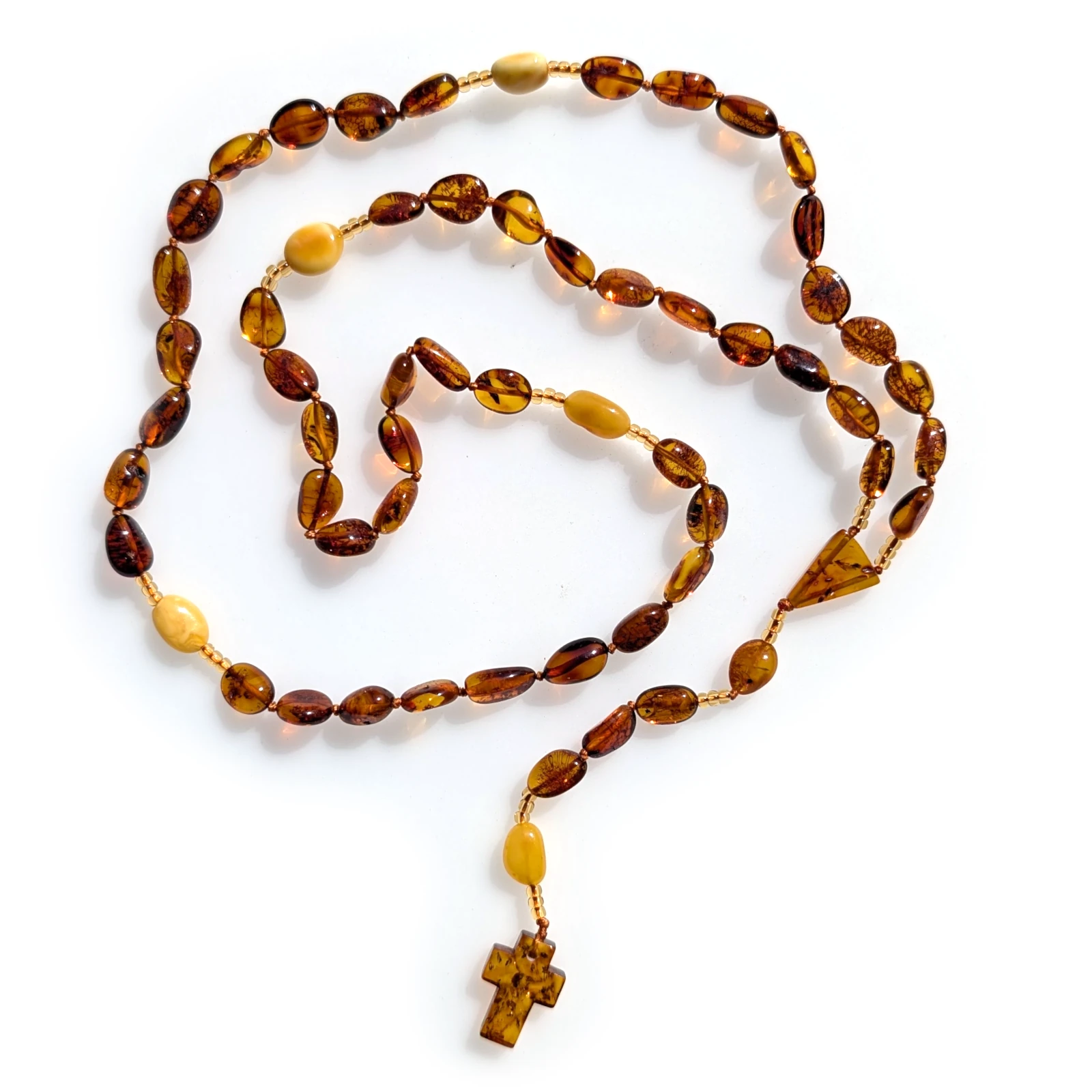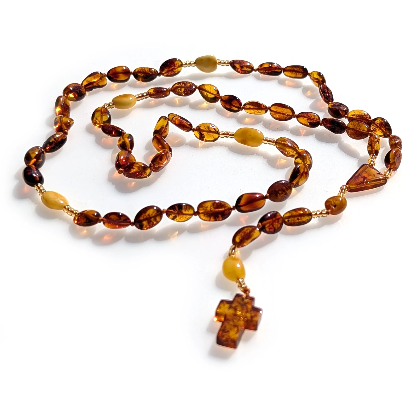 Zastosowanie bursztynu w różańcu gwarantuje niepowtarzalność oraz ciepło jakiego nie uzyskamy stosując kamienie naturalne czy plastik.