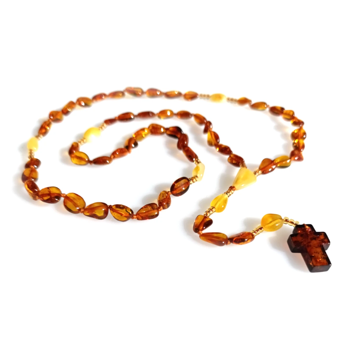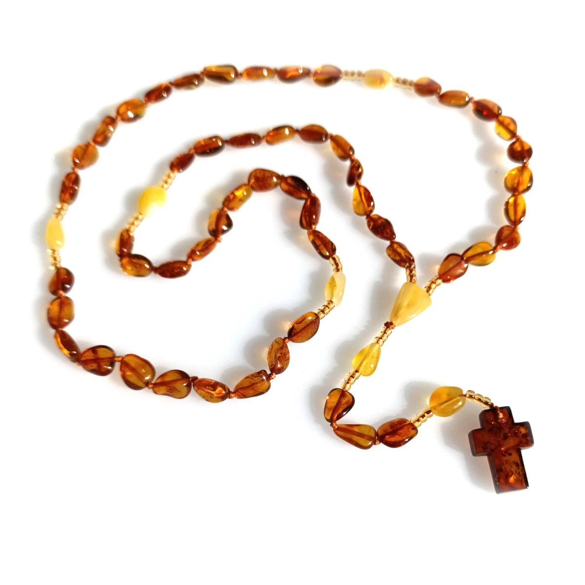 Różaniec bursztynowy na sznurku. Krzyż bursztynowy.