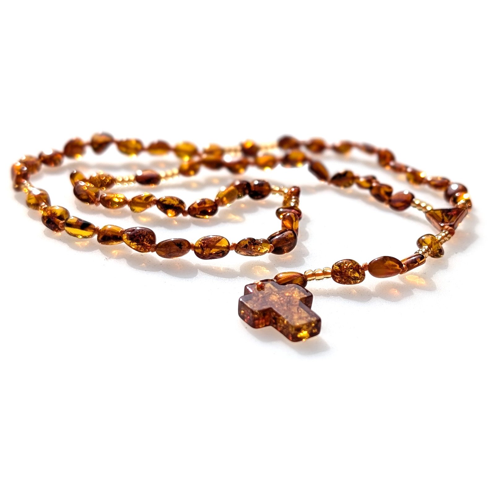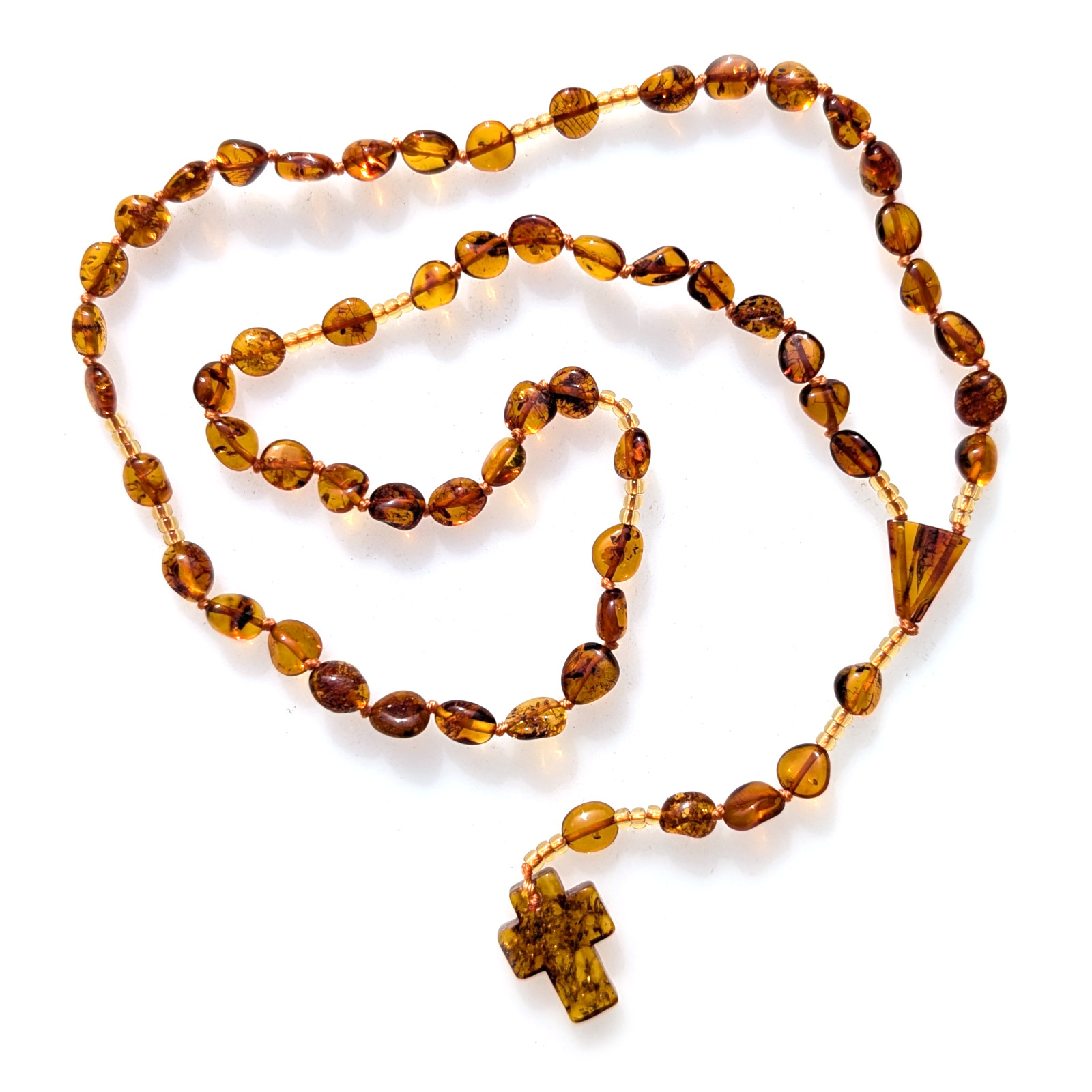 Zastosowanie bursztynu w różańcu gwarantuje niepowtarzalność oraz ciepło jakiego nie uzyskamy stosując kamienie naturalne czy plastik.