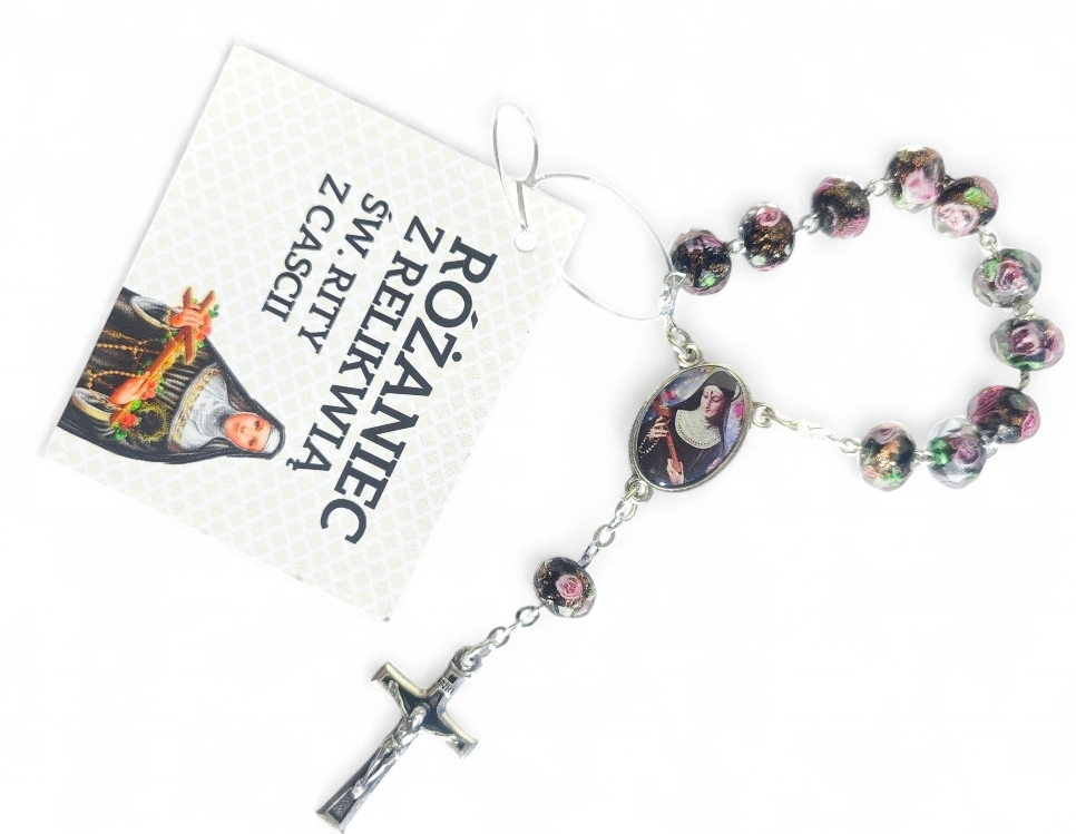 Różaniec dziesiątka z relikwią Św Rity z Cascii szkło weneckie.