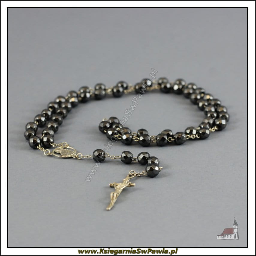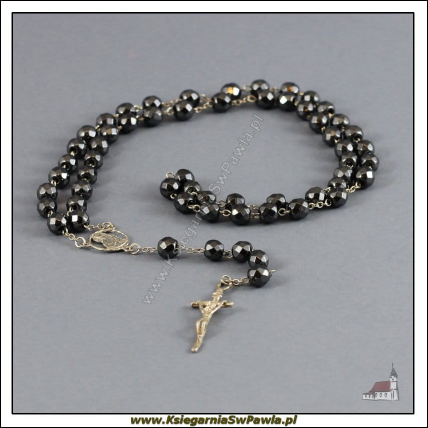 Różaniec hematyt czarny, fasetowany, łączony srebrem. Krzyż Papieski