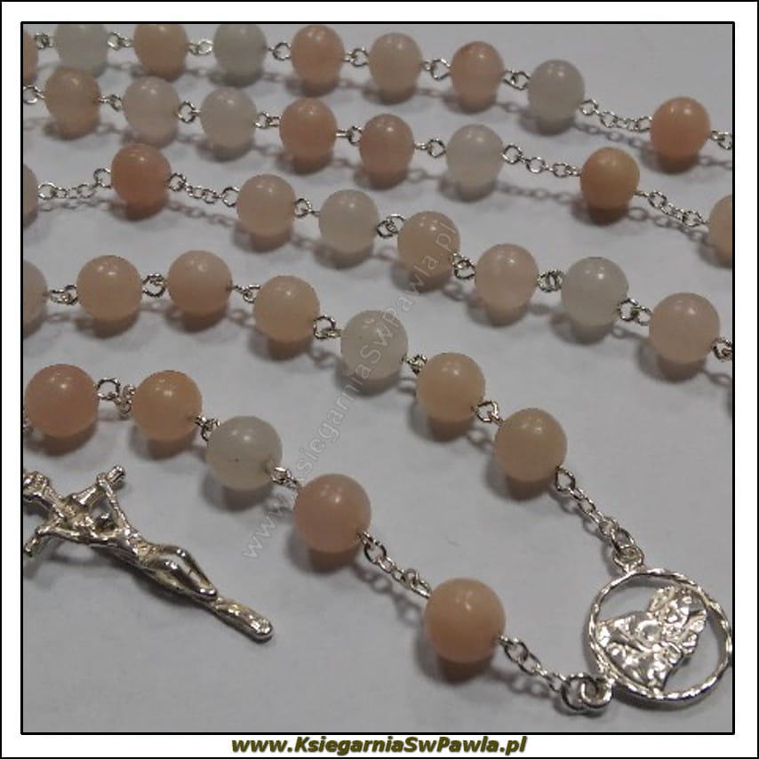 Różaniec pamiątkowy. Kamień naturalny. Awenturyn w kolorach cielistych łączony srebrem próby 925. Krzyż papieski.