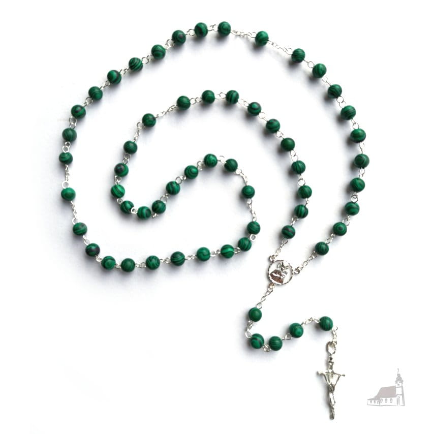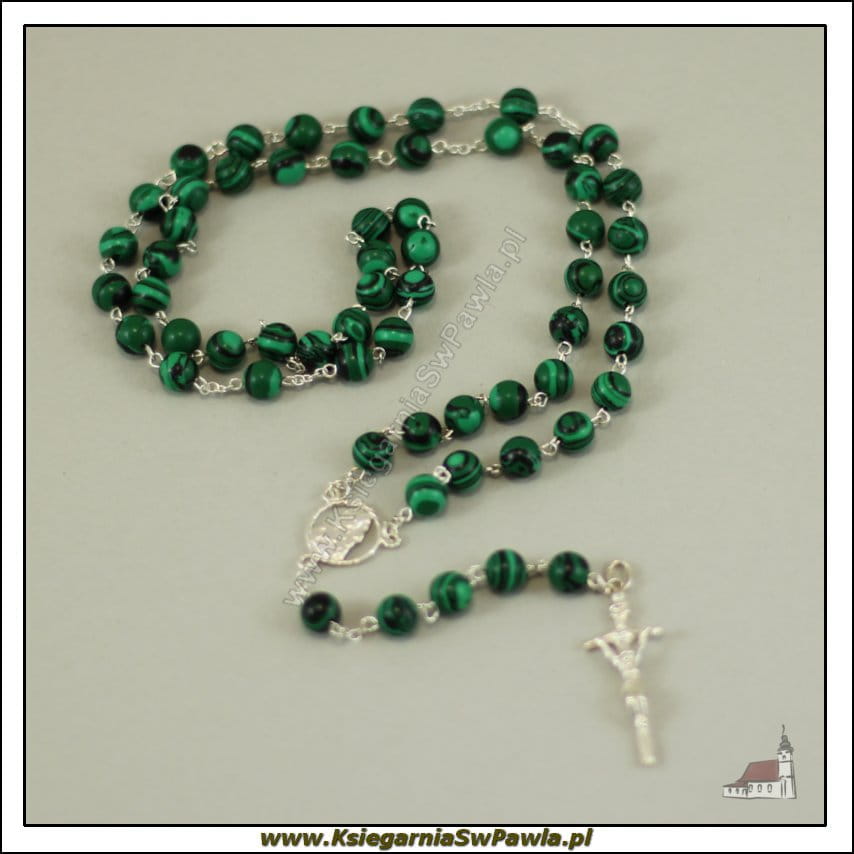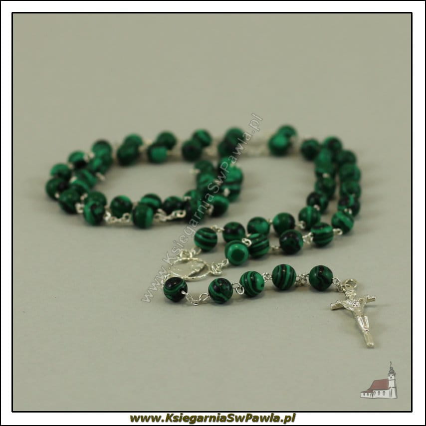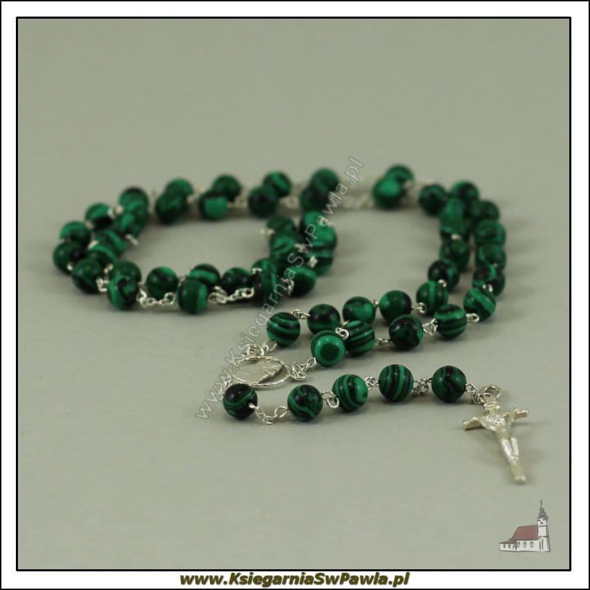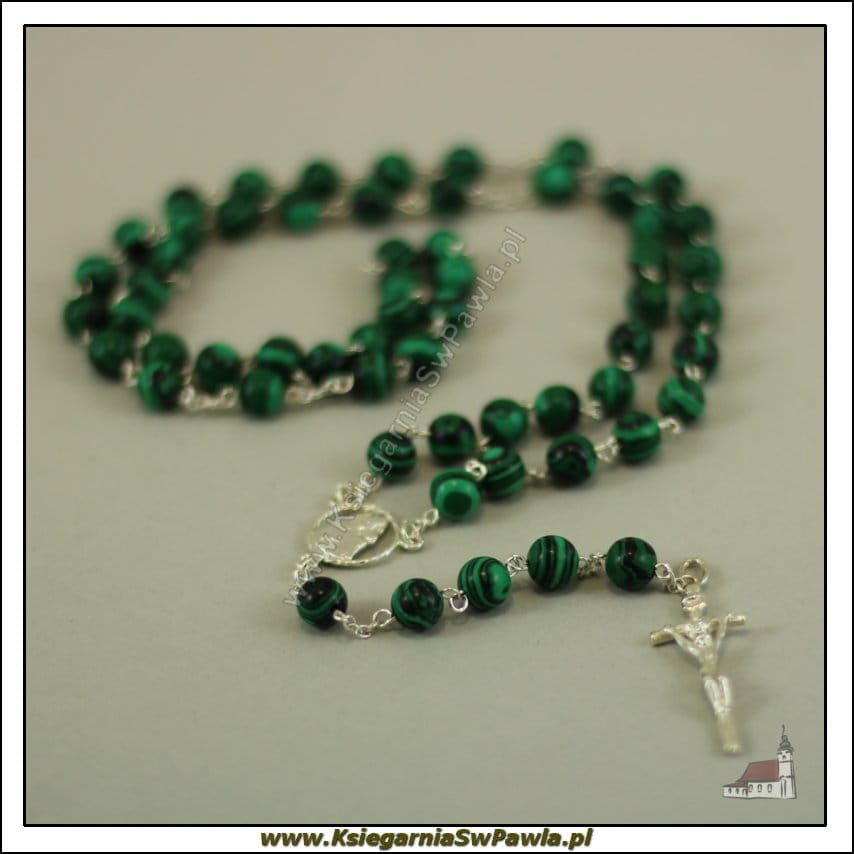 Różaniec malachit łączony srebrem. Krzyż Papieski