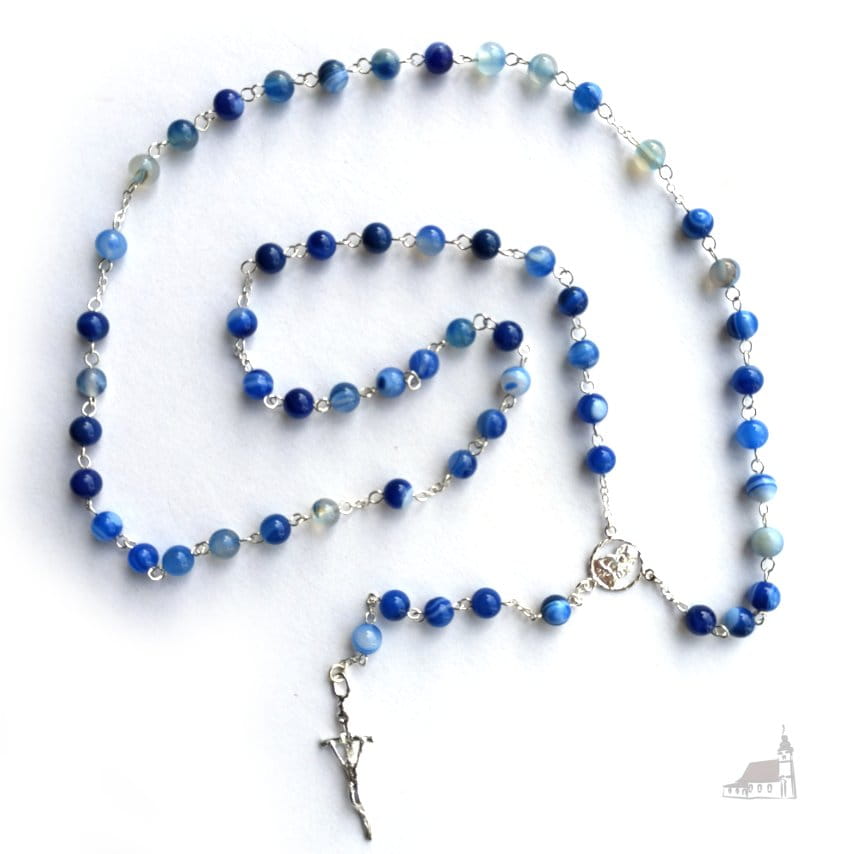 Różaniec pamiątkowy. Kamień naturalny. Agat koloru niebiesko-białego, łączony srebrem. Krzyż Prosty