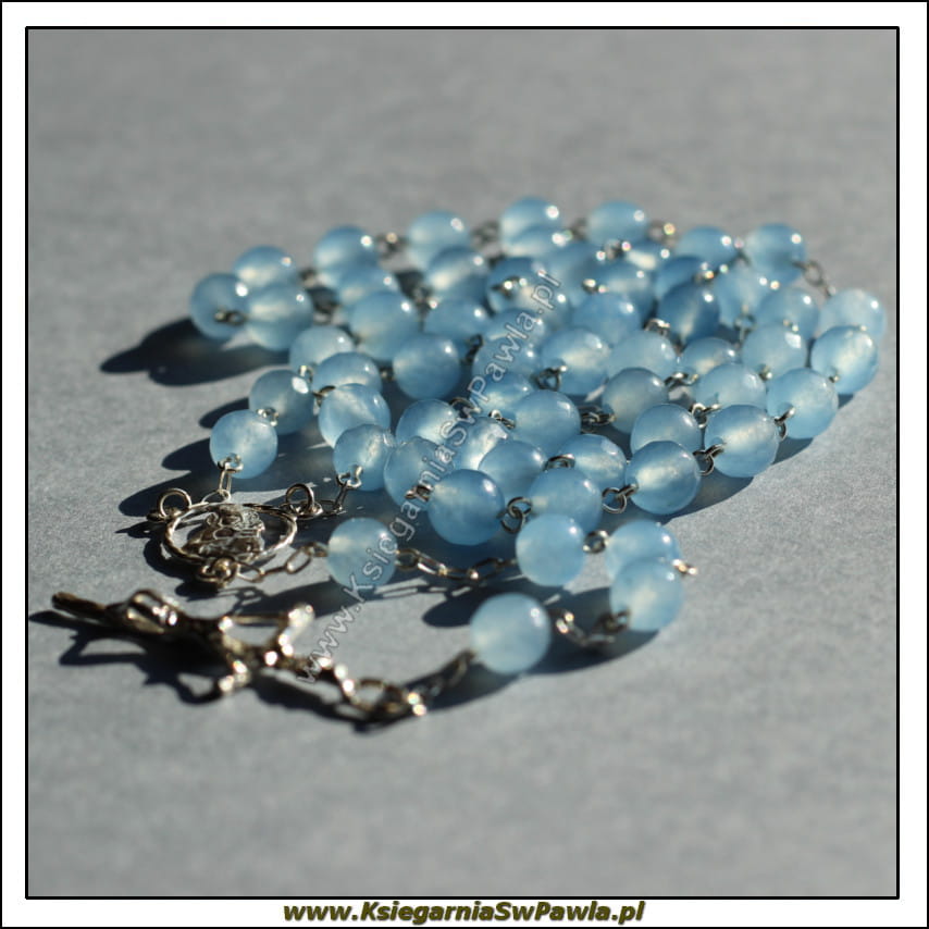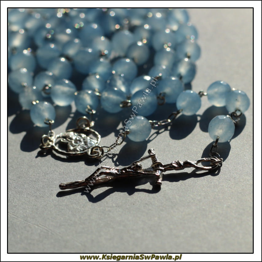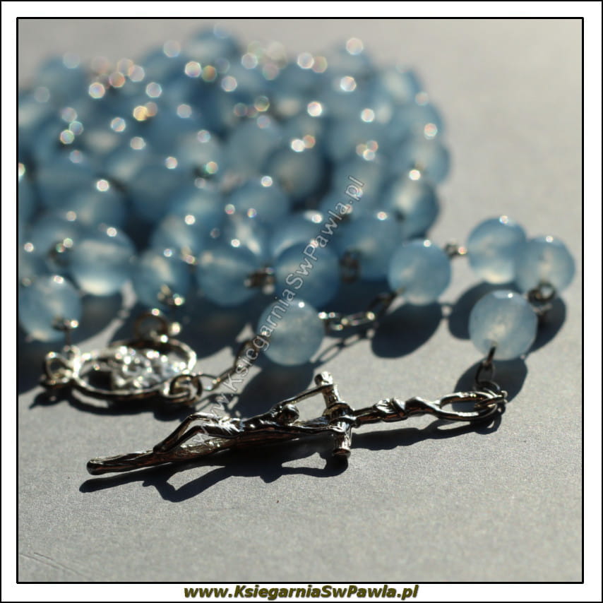 Różaniec pamiątkowy. Kamień naturalny, fasetowany. Niebieski, Jadeit łączony srebrem. Krzyż Papieski