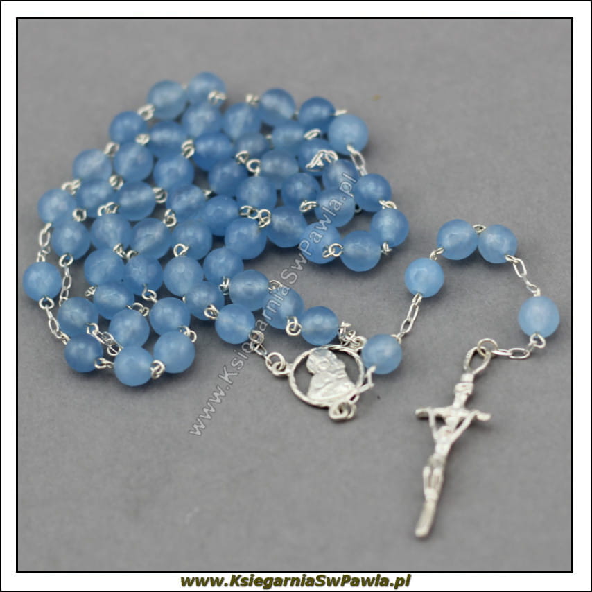 Różaniec niebieski jadeit łączony srebrem. Krzyż Papieski.