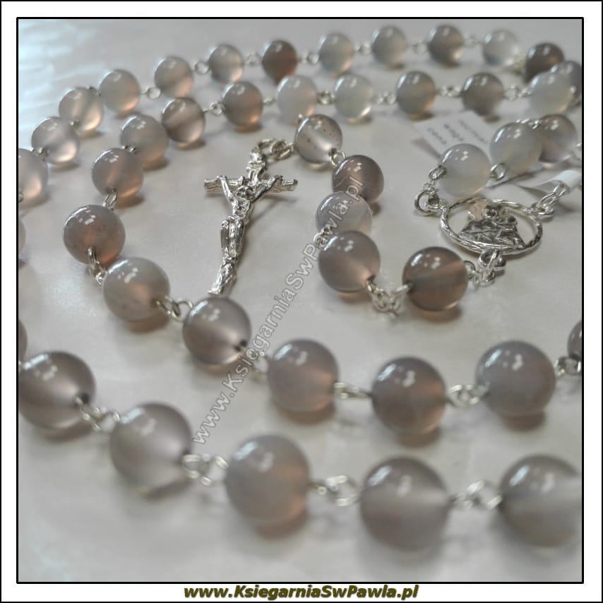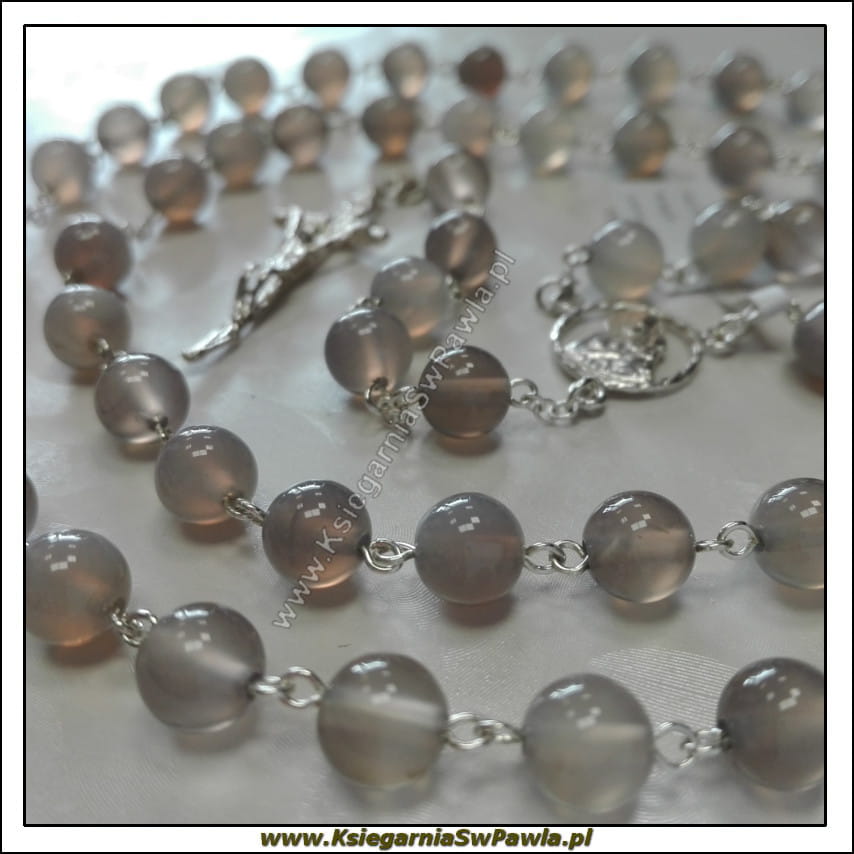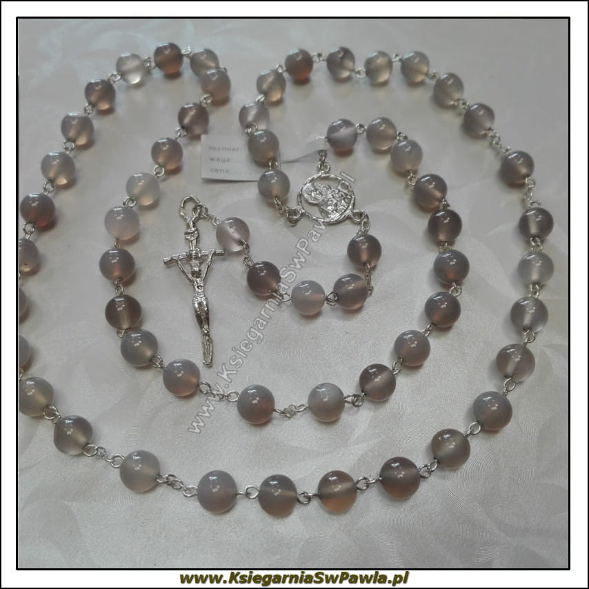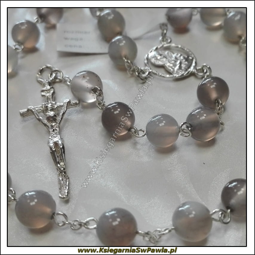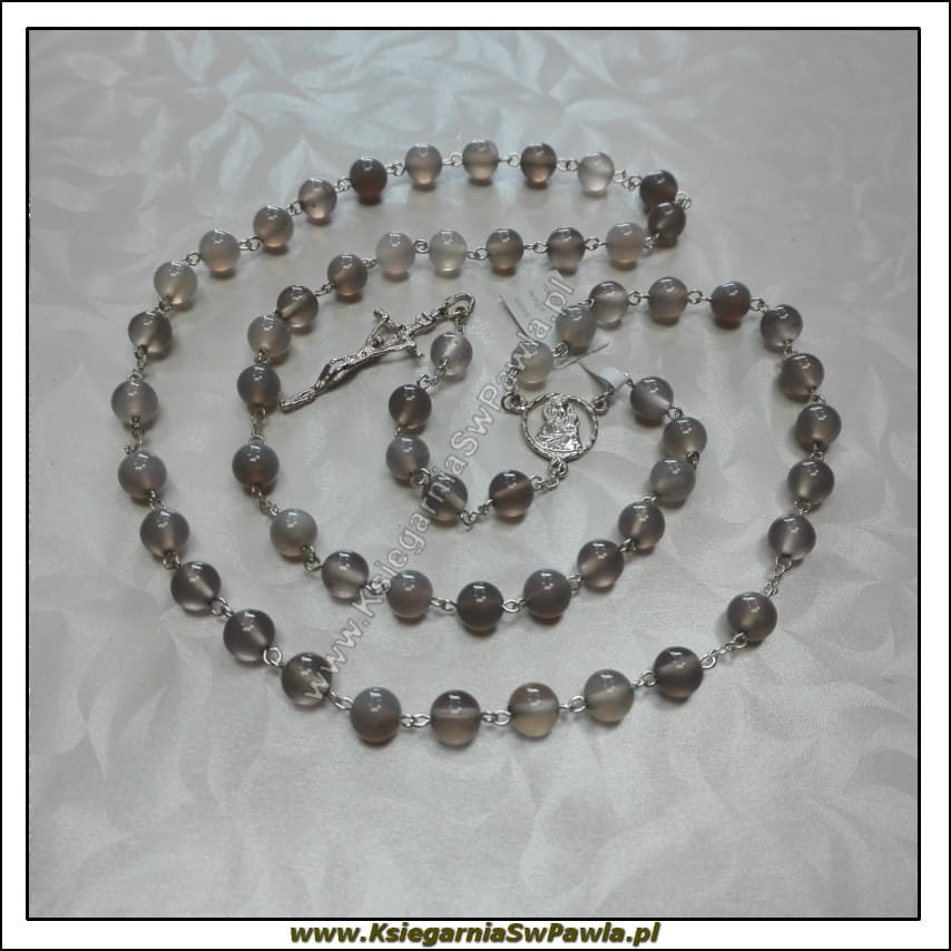 Różaniec pamiątkowy. Kamień naturalny. Agat półprzezroczysty, dymiony, łączony srebrem. Krzyż Papieski