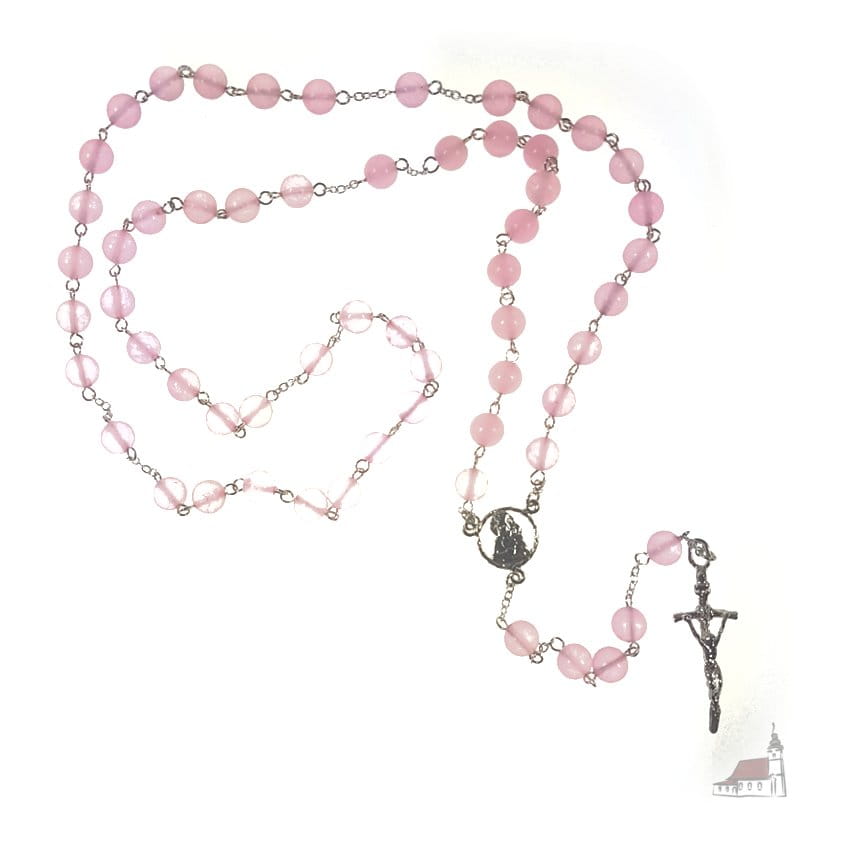 Różaniec różowy jadeit łączony srebrem. Krzyż Papieski.