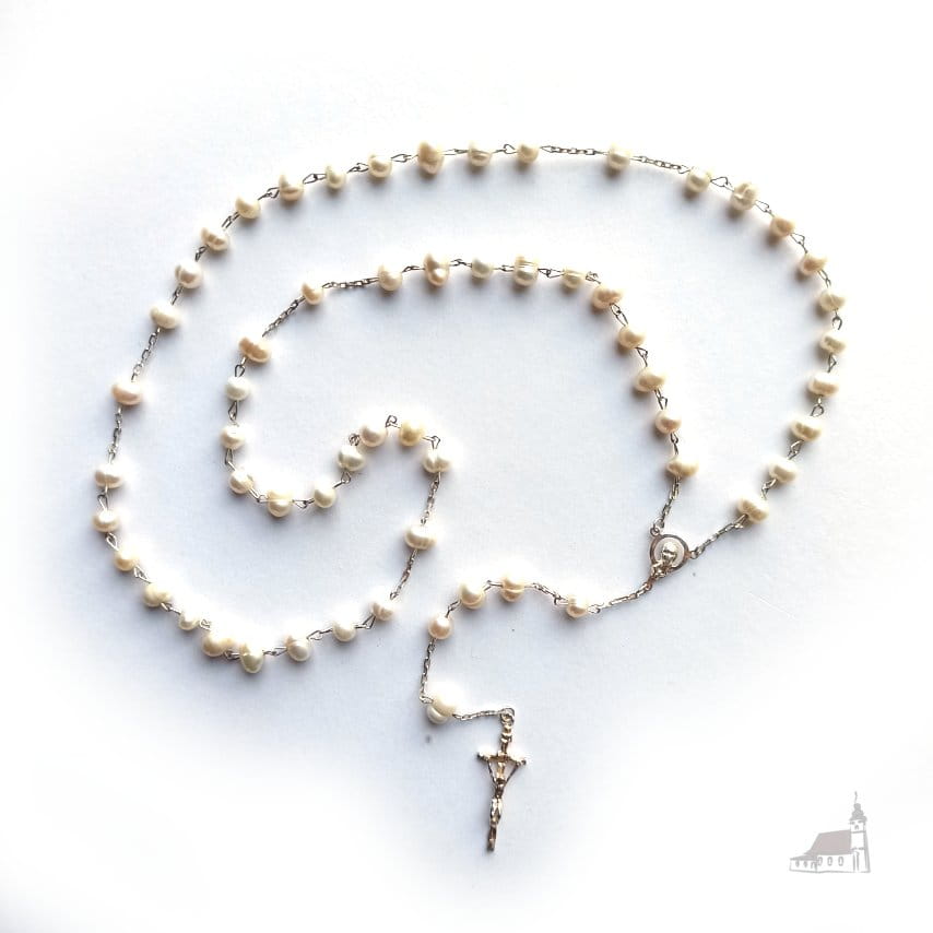 Różaniec z naturalnych pereł słodkowodnych łączonych srebrem. Krzyż papieski.