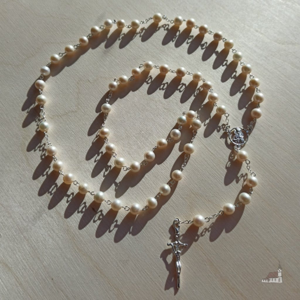 Różaniec z naturalnych pereł słodkowodnych łączonych srebrem. Krzyż papieski.