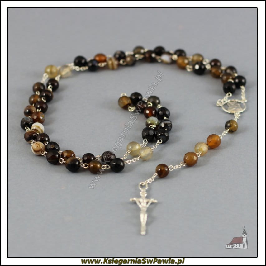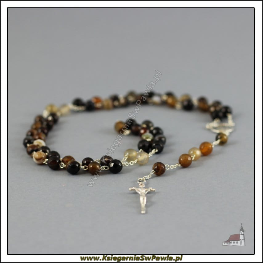 Różaniec pamiątkowy. Kamień naturalny. Agat różnokolorowy, łączony srebrem, fasetowany. Krzyż Papieski