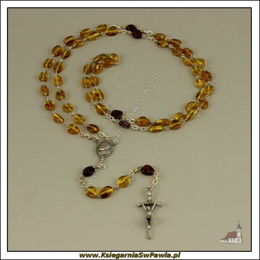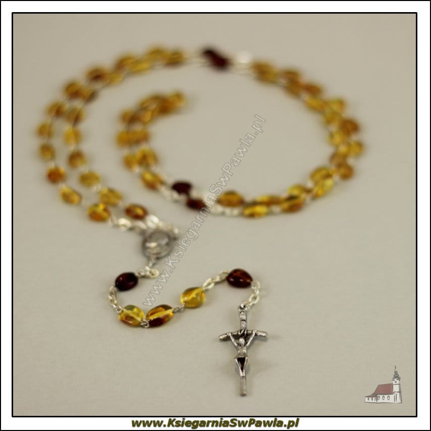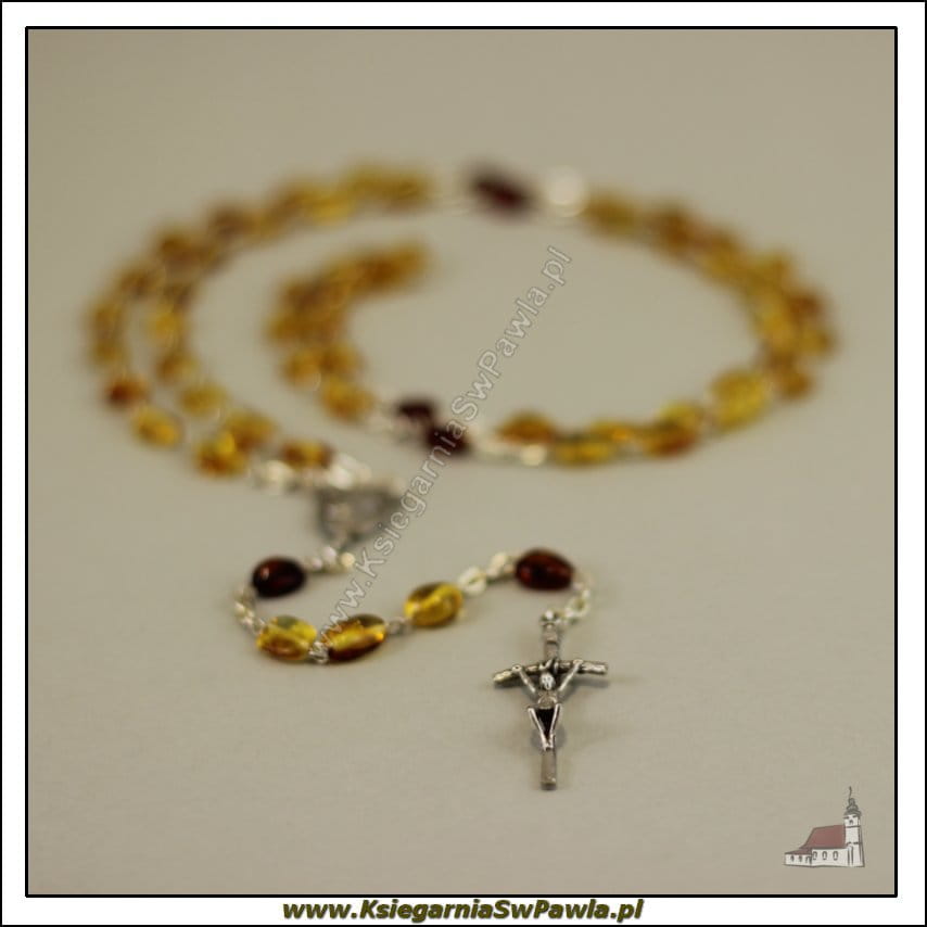 Różaniec z bursztynu łączony metalem. Krzyż Papieski.