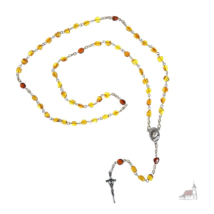 Różaniec z bursztynu łączony metalem. Krzyż Papieski.
